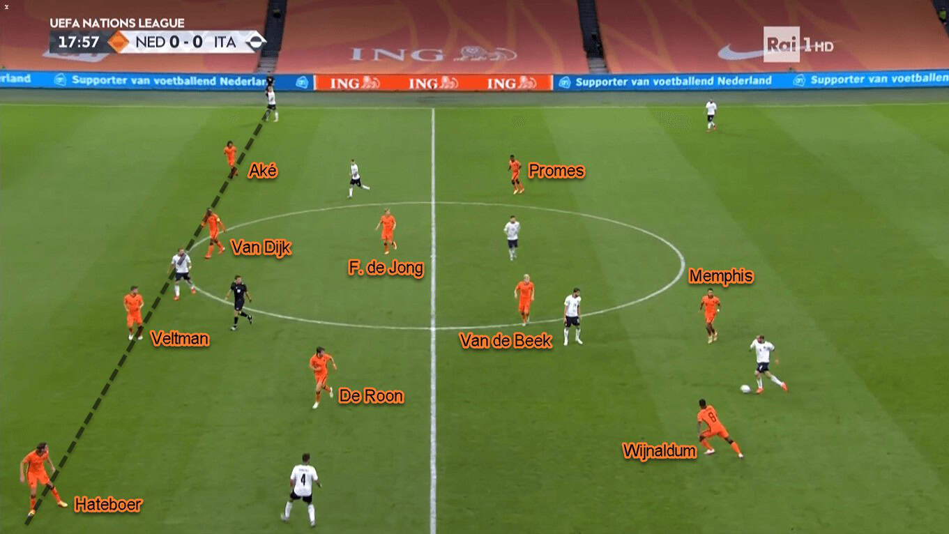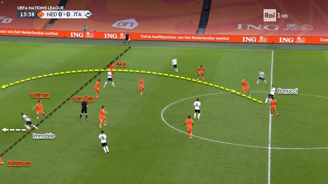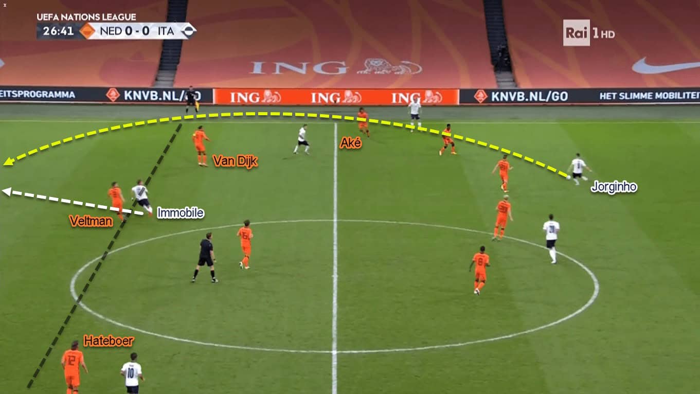 Italy usually target the right centre-back, Veltman, when exploiting the high defensive line. That’s because the new Brighton recruit was found (way) behind his fellow defenders from time to time. If we look at the stats, Veltman and the right-back Hateboer finished the game with 13 defensive duels each. In the opposite side, Aké and Van Dijk combined for only six defensive duels.