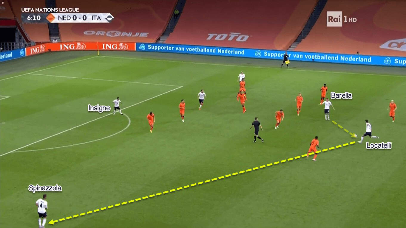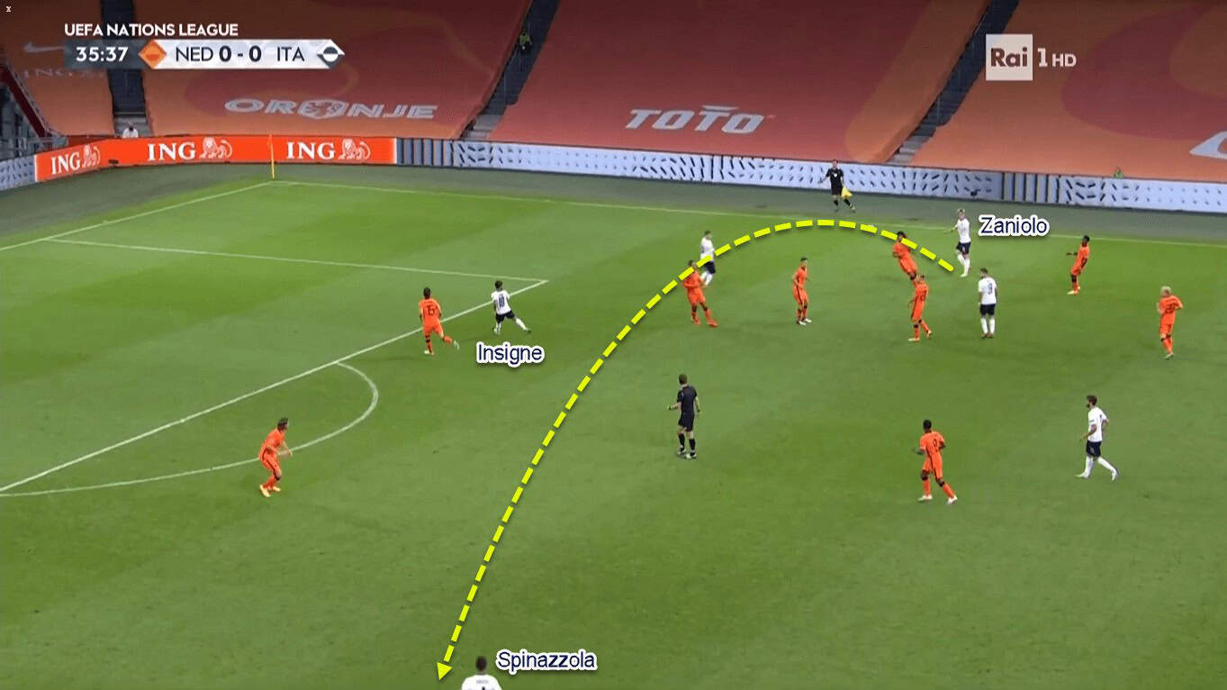 Italy’s initial focus in their attacks was to access Barella or Insigne in between the lines. That’s because they would have a numerical as well as positional superiority against sole Dutch’ defensive midfielder in between the lines. After that, either Barella or Insigne could send the ball wide for the flank players to continue the attack. However, this approach didn’t last long because the home side adjusted their defensive structure not long after Italy exploited the issue.