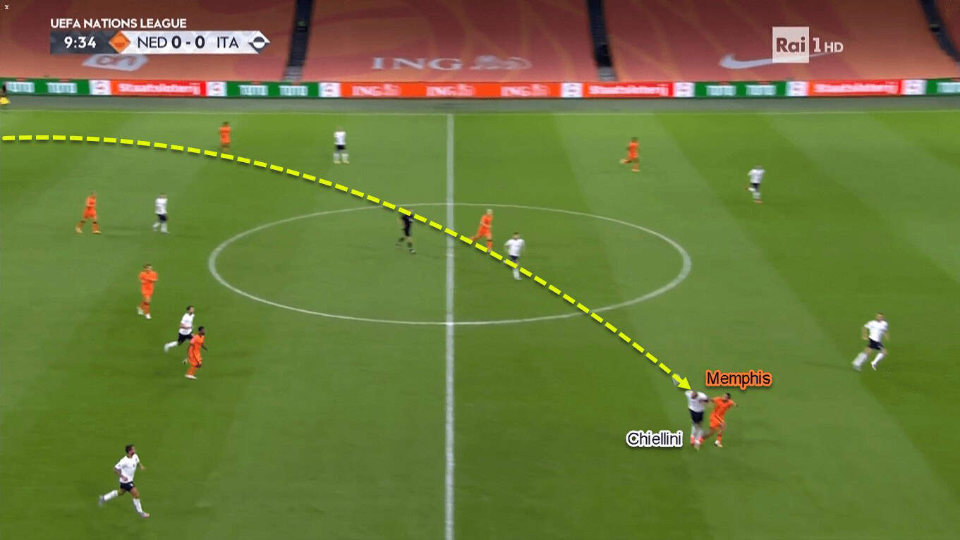 With no nearby passing options available, Cillessen only had two options: play directly to the attackers or send the ball to the full-backs. The first strategy didn’t work very well. That’s because of Memphis and co. lacked physicality against Italy’s towering centre-backs. If we look at the stats, the former PSV attacker finished the game with zero aerial duels won from three attempts.