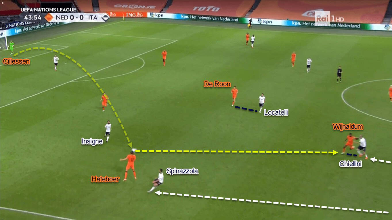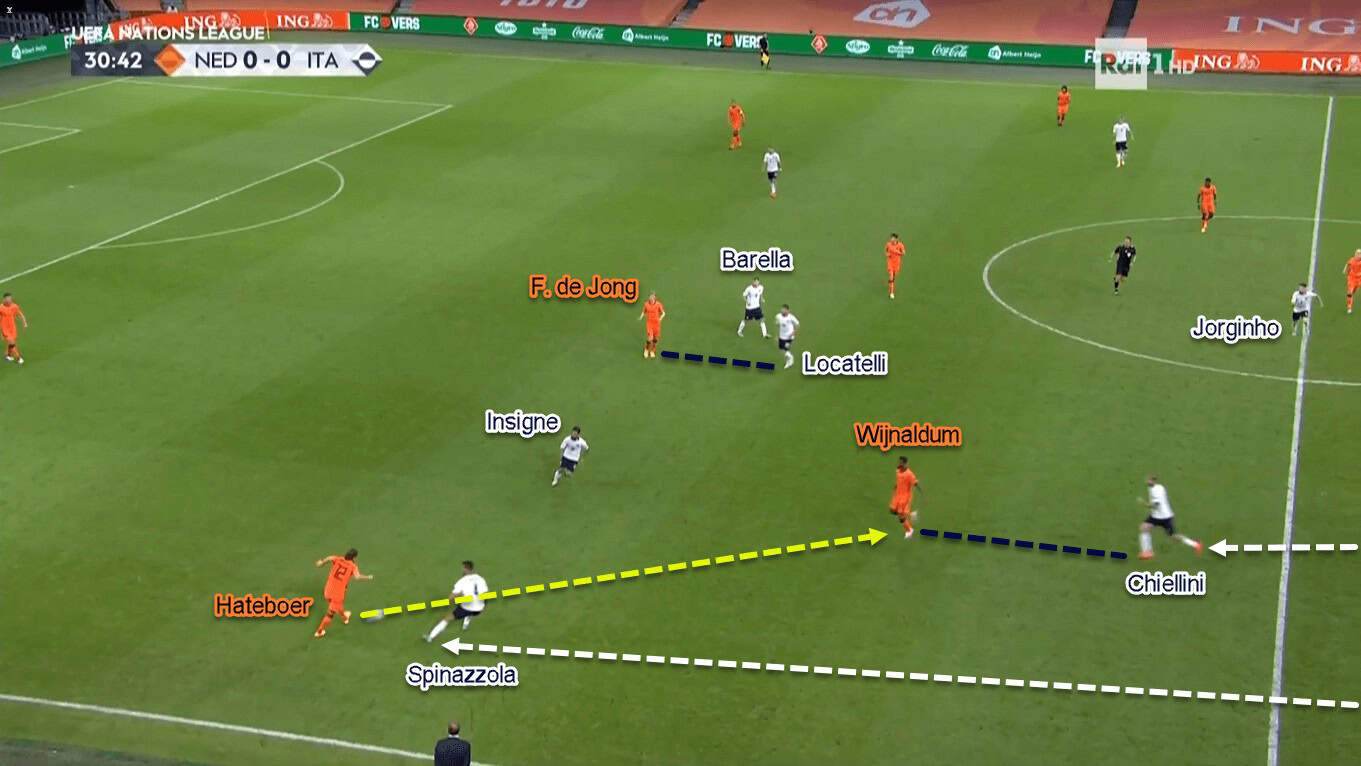 Italy’s lopsided press wasn’t just about the positional rotations, though. They made it more difficult for the on-ball Dutch player by closing nearby passing routes, especially to the central area. Neither Hateboer nor Aké couldn’t play to De Roon or F. de Jong because Locatelli and Barella would close them respectively.