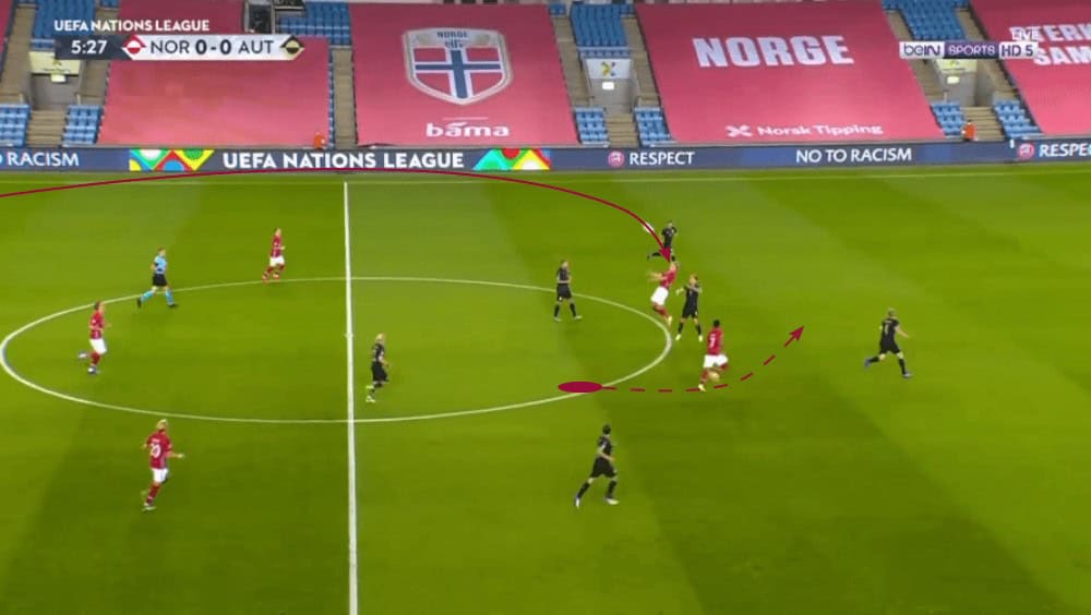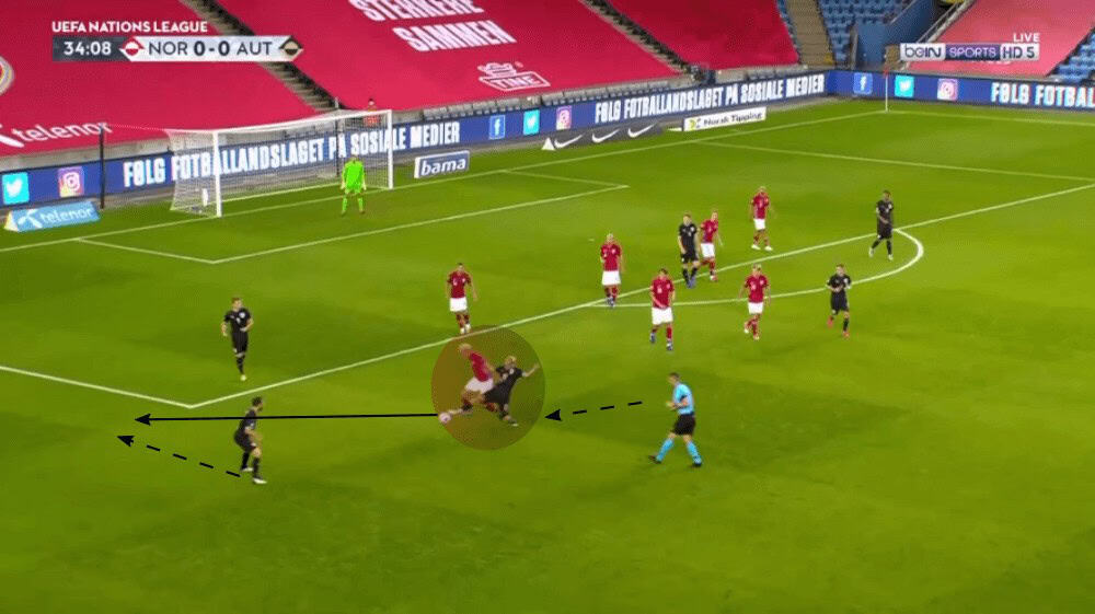 When they had no chance to progress the ball further up the pitch due to the lack of passing options or Austria’s high press, they tried to find Haaland with a long ball, with King looking to make a deep run behind the last line of the defence as they hoped that Haaland would win the header. An example is illustrated in the image below. However, Austria’s central defenders mainly won those aerial duels and additionally, Foda’s side had more players in the correct space to win the second ball.