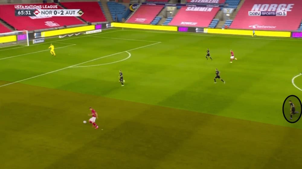 Therefore, we could often see that after the recovery they tried to play as quickly as possible forward to then exploit these free spaces in the wide-areas. Norway’s only goal of the day was scored in the 66th minute exactly out of such a counter-attack as they were able to find Alexander Sörloth in that space with a through ball. He then delivered a low cross which Haaland converted into a goal. In the image below you can see how much space he had and note how Lainer tries to get back, but he was once more positioned very high during the own possession phase.