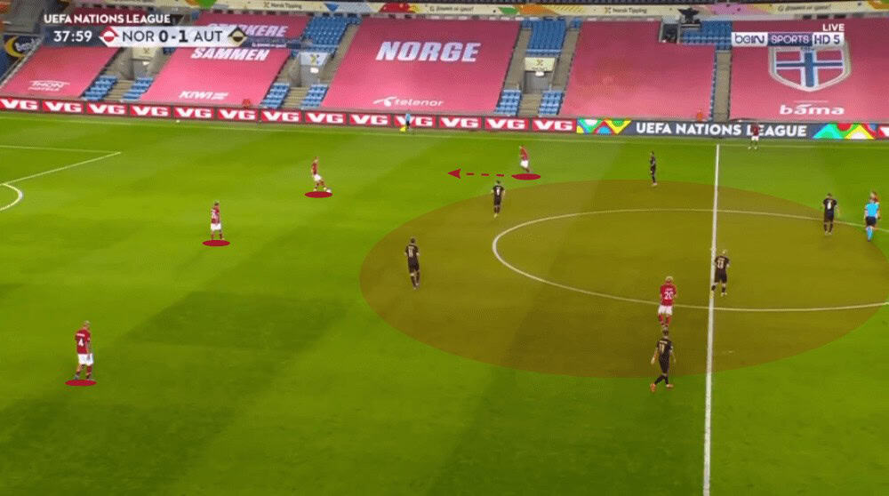 Foda decided to mirror this formation by moving Sabitzer forward next to Gregoritsch who would press the centre-backs while Schlager and Ilsanker followed the two central midfielders of the opposition. In the wide-areas, the wingers moved forward to the full-backs and Ulmer and Lainer looked after Thorsby and Johansen. Haaland and King were marked by the central defenders of Austria.