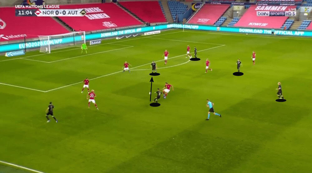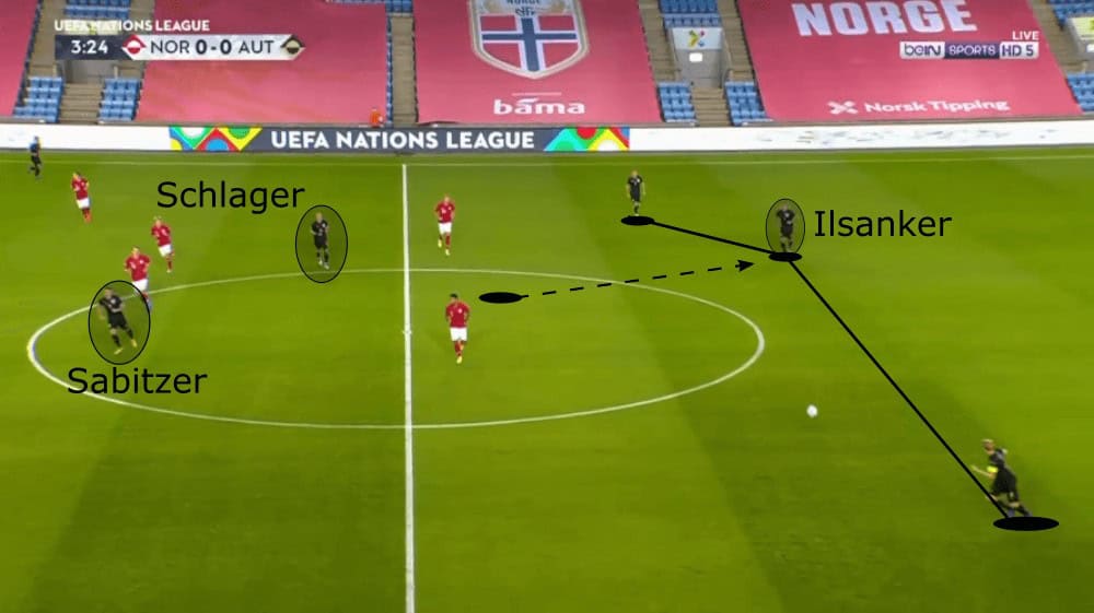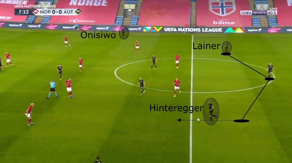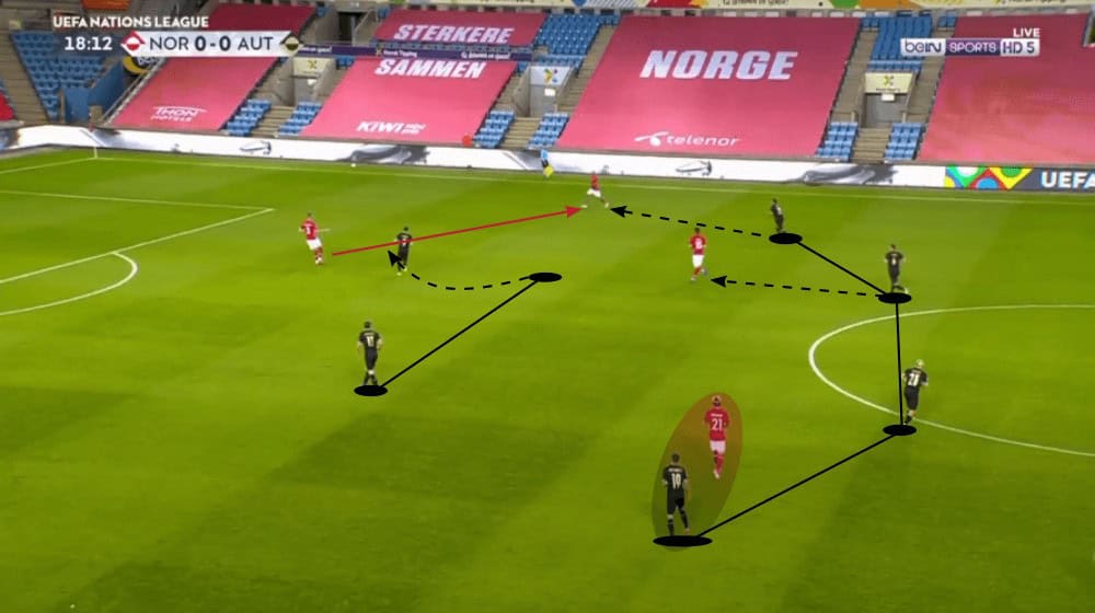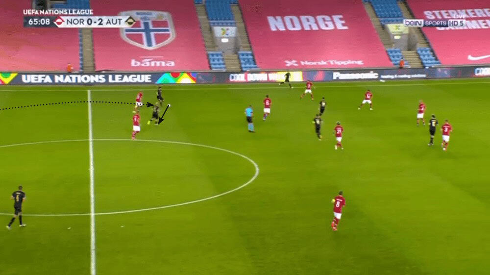 Anyways, the man in Austria’s squad who was most of the time responsible for the progression of the ball was Hinteregger. From a central position, he often played great through passes towards Lainer or decent long balls to Ulmer while on the left side he dribbled forward to lure a player of Norway out of his position to then play a line-breaking pass.