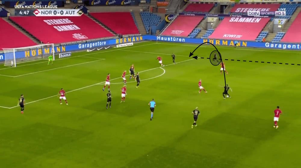 Another reason behind the pattern was that Lainer started his forward runs at a later stage during the attack while Ulmer permanently stayed higher. By letting Lainer start his runs in deeper areas, it enabled him to pick up speed before he entered the final third. This meant that it would be harder for the opposition to defend against him. Additionally Austria could get themselves in a very dangerous situation if they were able to exploit that with through passes like the one in the example below.