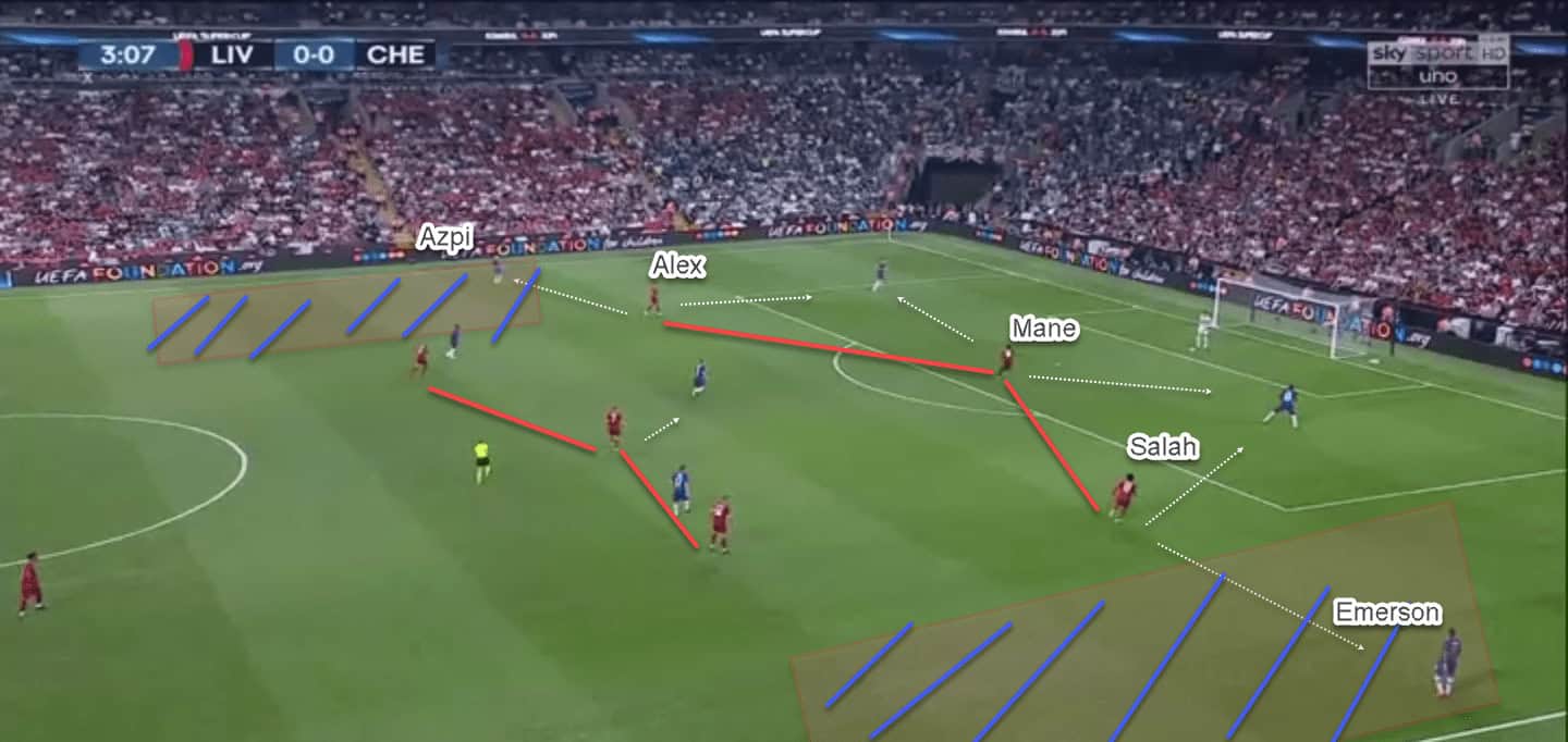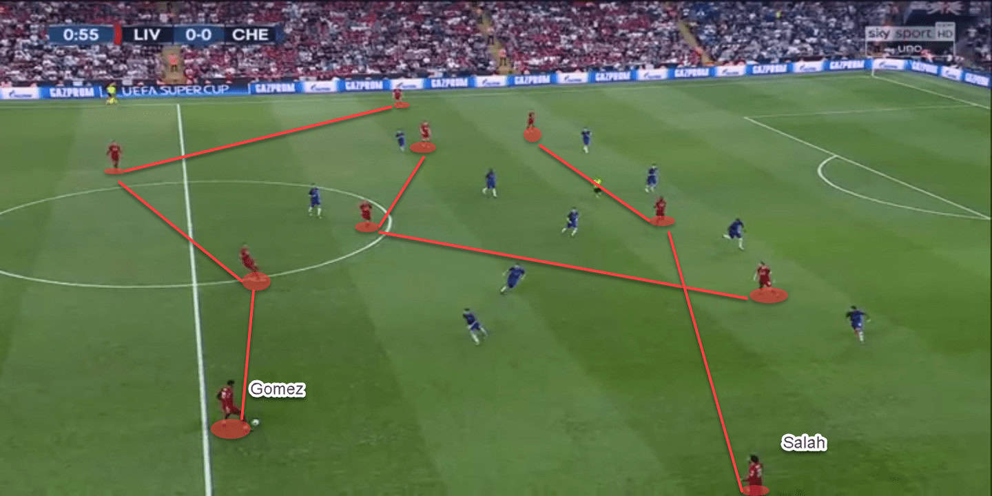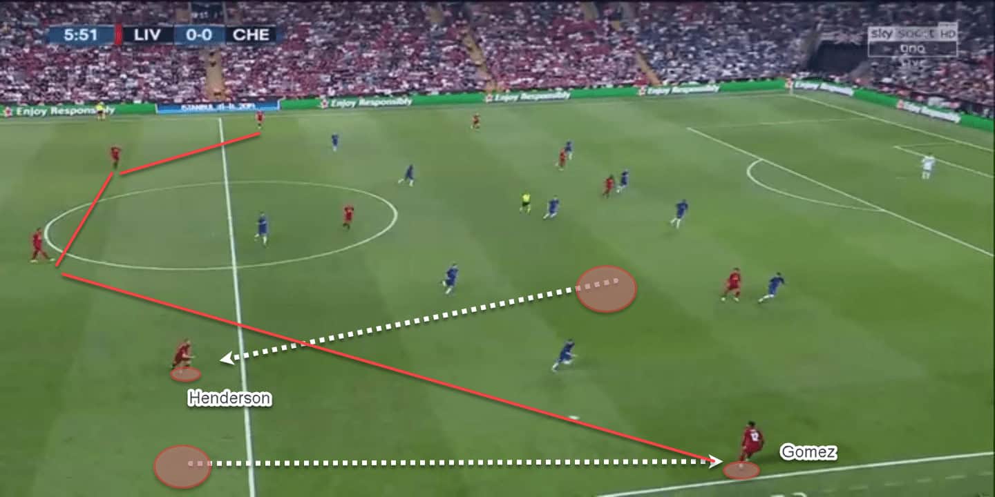On the other flank, it was mostly the full-back – Gomez, providing defensive cover while Salah and Henderson looked to combine and isolate the Chelsea full-back (Emerson).