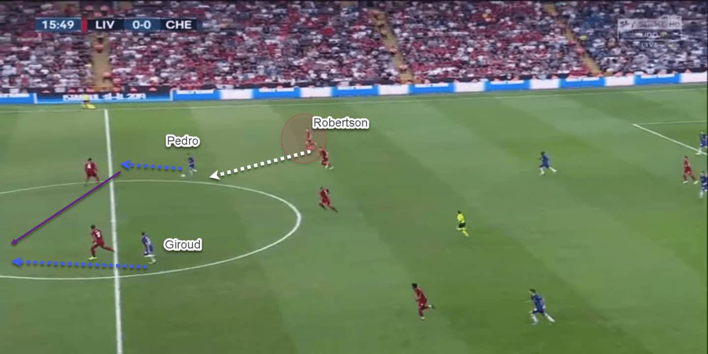 On the other side, Andrew Robertson couldn’t push up with regularity due to Pedro’s positioning – the latter was trying to exploit those wide spaces during transitions and Liverpool needed some cover in that region.