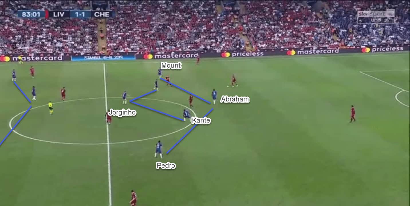 Chelsea defended in a 4-1-4-1 or a 4-5-1 during the entire game. This is clear from the picture below. Both of them are relatively easy to get into from their 4-3-3 and hence, is the most common defensive block for any team playing an offensive 4-3-3. They positioned themselves in a mid-block and only pressed when Liverpool tried to cross the half-way line.
