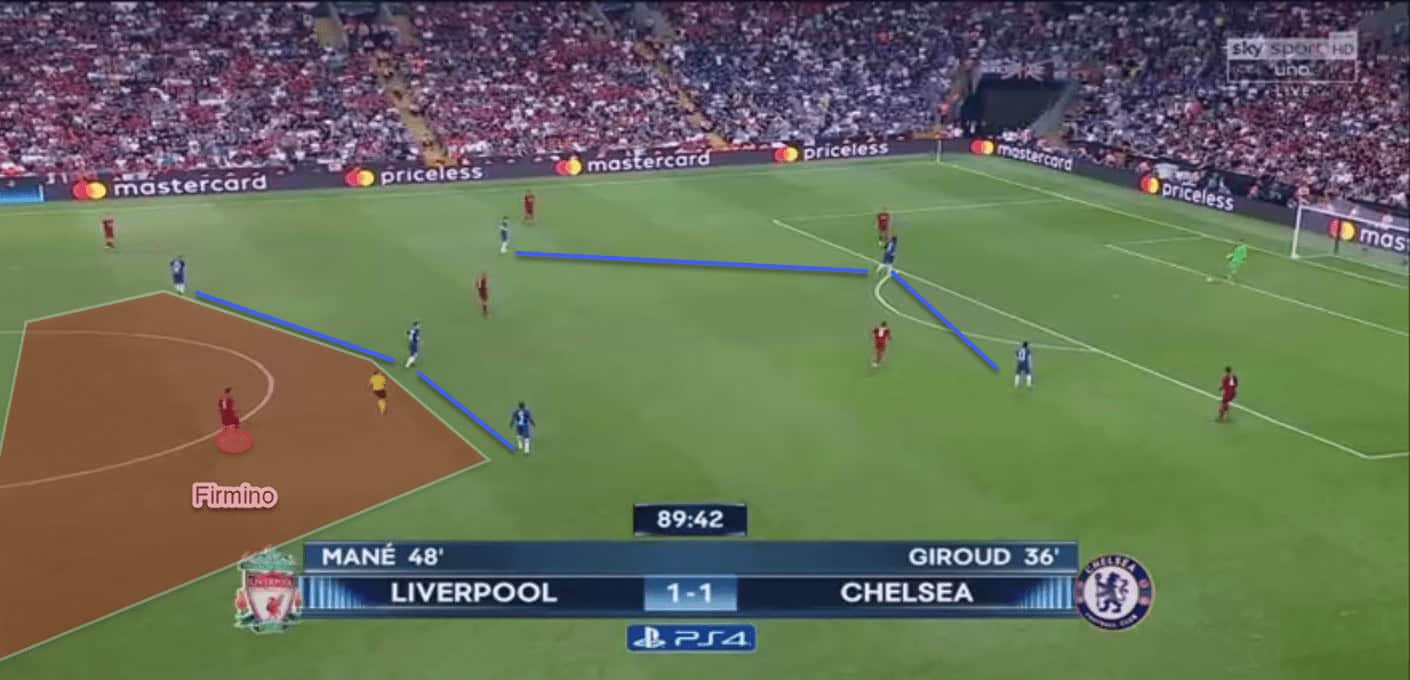 Firmino in pockets of space behind Chelsea’s midfield