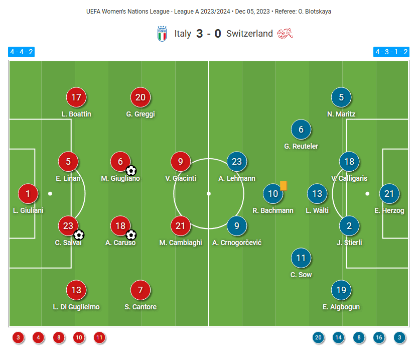 On the other hand, Gertschen used the 4-3-1-2 formation with RB Leipzig’s Elvira Herzog as a goalkeeper, Arsenal’s Noelle Maritz as a right-back, PSG‘s Viola Calligaris and Zürich’s Julia Stierli as centre-backs and Roma’s Eseosa Aigbogun as a left-back. The midfield was composed of Géraldine Reuteler, Lia Wälti and Coumba Sow. At the same time, Ramona Bachmann was the advanced playmaker behind the two strikers: Aston Villa’s Alisha Lehmann and Atlético Madrid‘s Ana-Maria Crnogorčević.