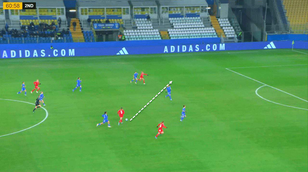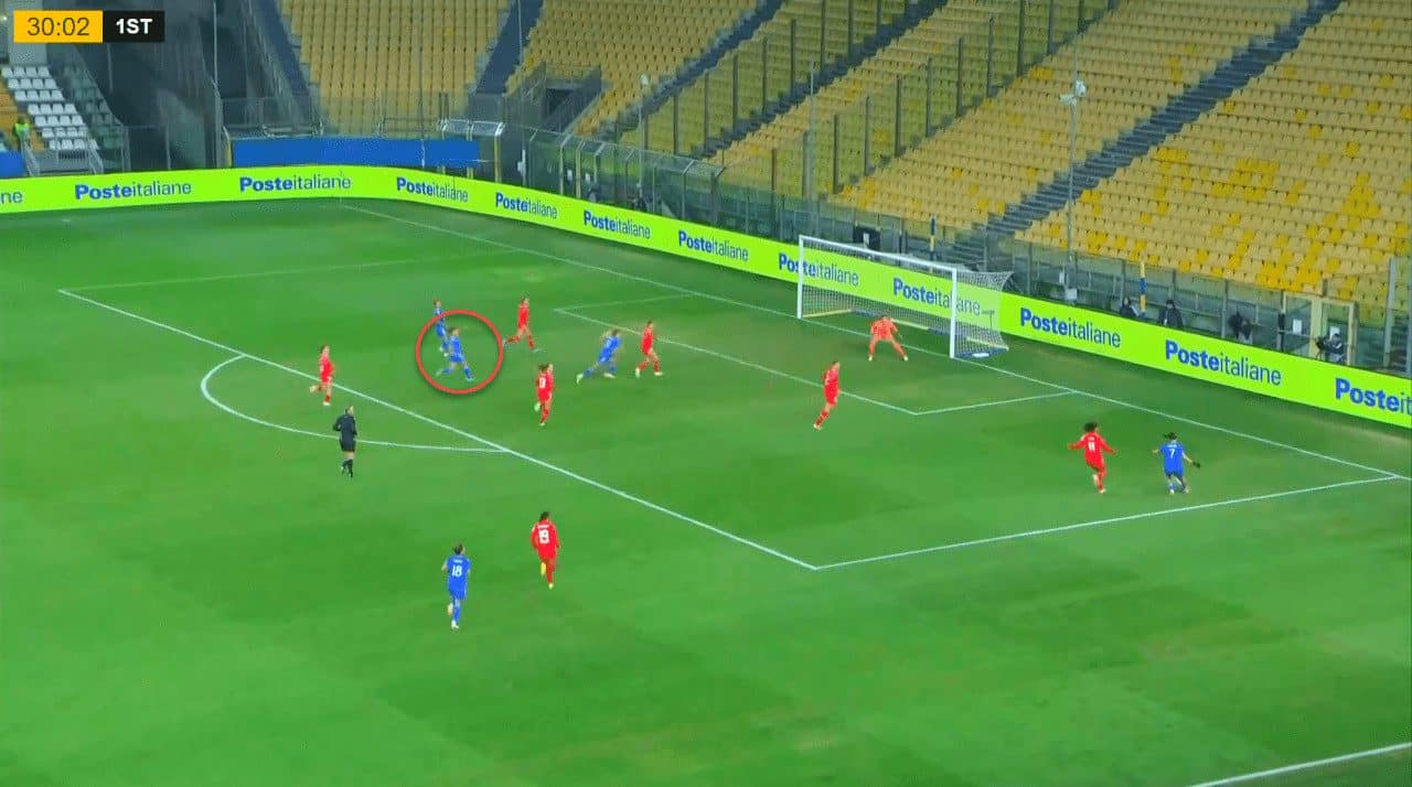 The following example from the action that created the first goal highlights the space left by Switzerland’s defence and shows how Caruso was critical in making this attack happen by positioning herself well to receive a pass from Cantore before providing her a pass into space in a dangerous area.