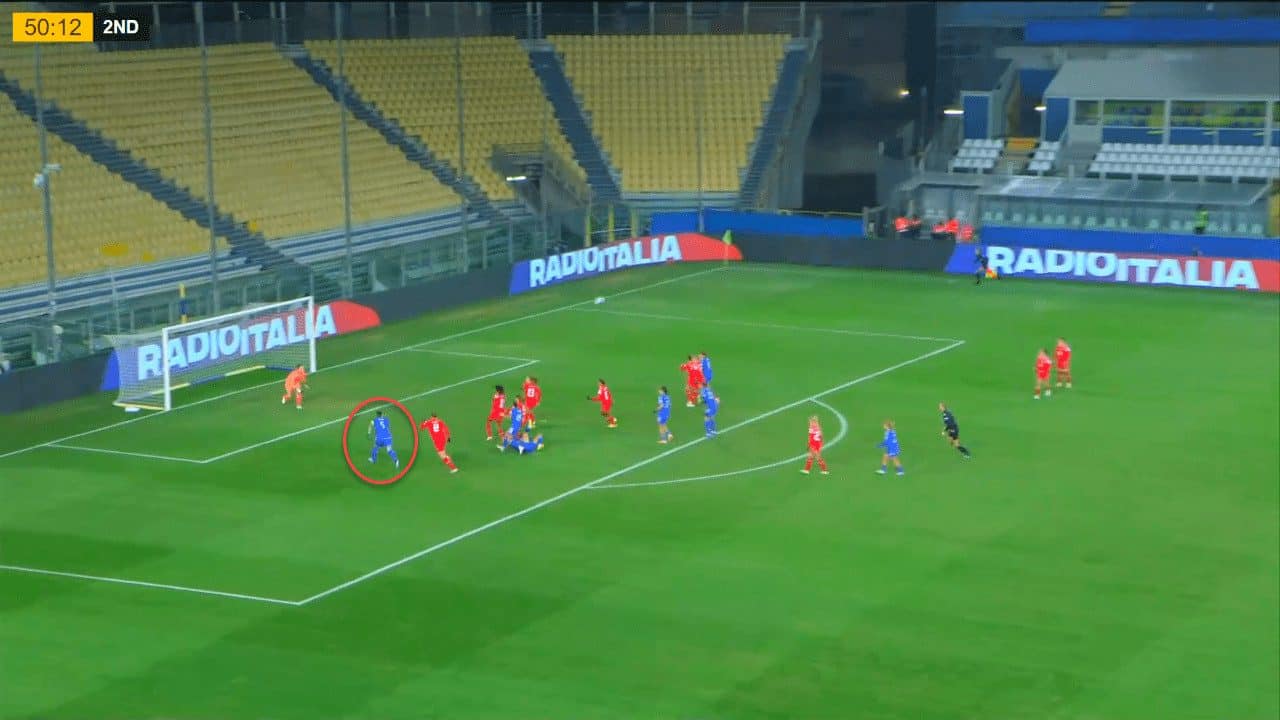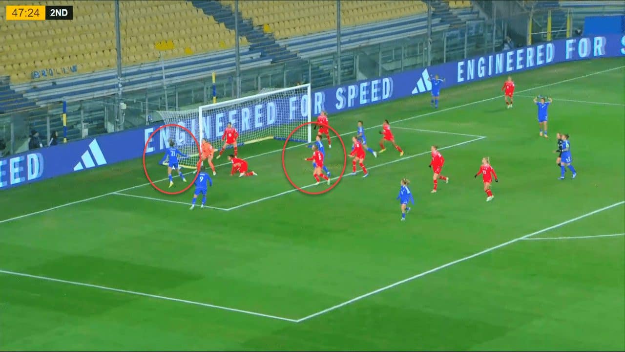 In terms of set-pieces, Switzerland failed to mark properly as well and risked conceding another goal if Linari finished the action with more accuracy as she was completely free inside the box when the free-kick was executed. Stierli was not even looking at Linari when the free-kick was about to be executed. Therefore, she was not aware that Linari was running at her back, which created a goalscoring situation due to poor marking.