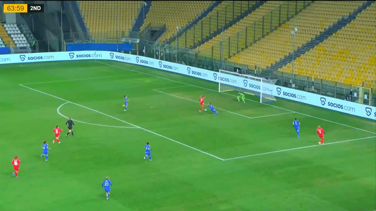 Also, both Salvai and Cambiaghi were vital to scoring this goal as Salvai’s joining during corner-kicks was crucial to finishing this action. But most of all, the credit should go to Boattin, who insisted on crossing the ball when it was on its way out of the pitch while using her right foot to cross the ball accurately.