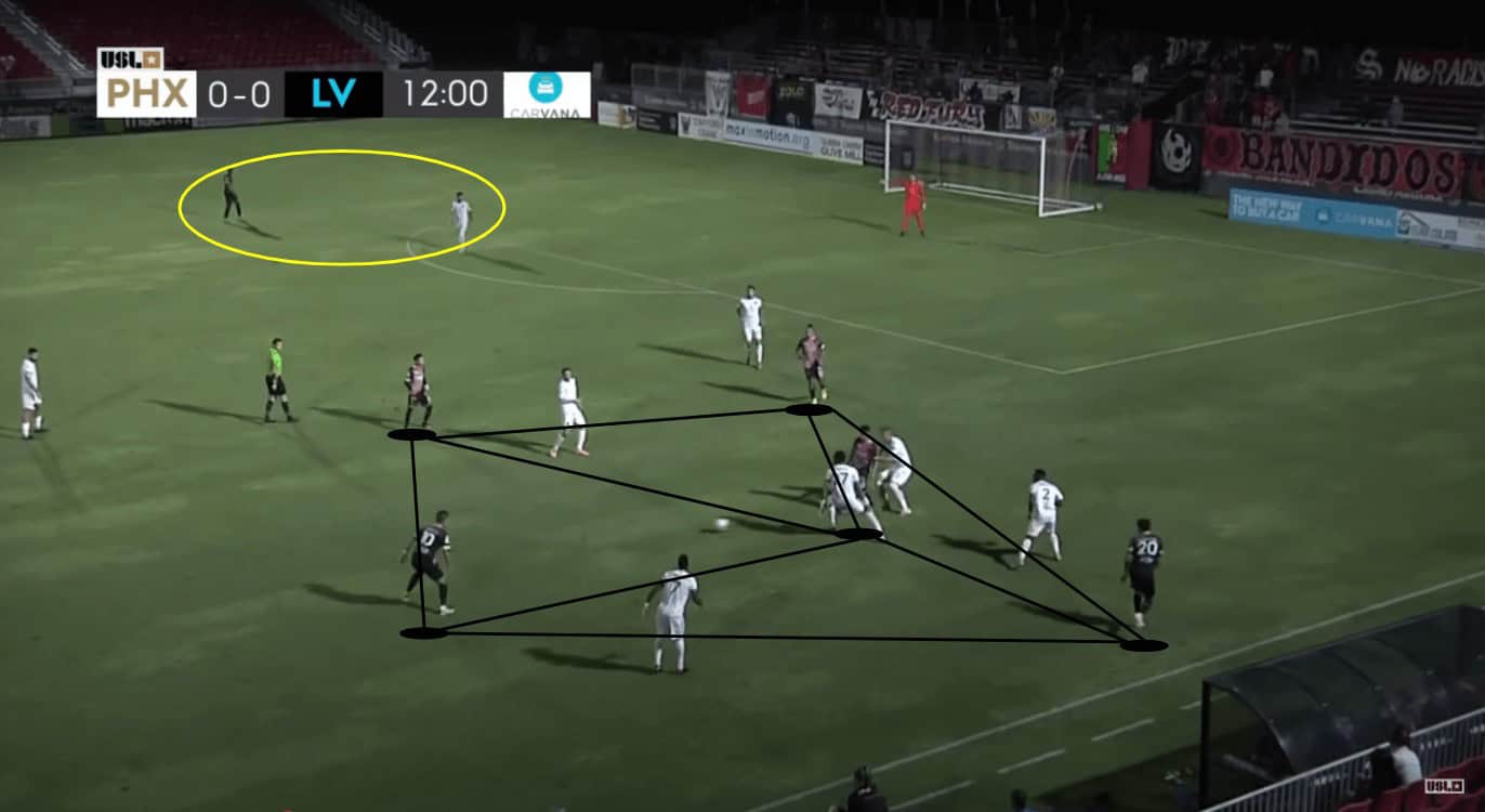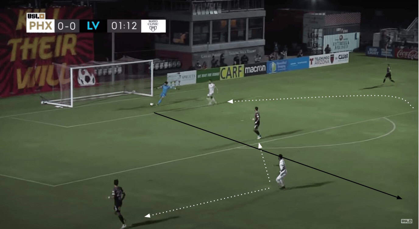 The image above highlights how effective Phoenix’s press was. Early in the match, Las Vegas was forced to play the ball back to their goalkeeper via their centre-back. When they did, Rufat Dadashov’s role was to provide pressure on the ball. His runs would start by pressuring the centre-back and follow the ball, which in this case went to the goalkeeper. As Dadashov pressed, Junior Flemmings also worked to maintain pressure on multiple opponents with his positioning. In the image above, he was able to pressure both the other centre-back (who wasn’t in the best position to support his goalkeeper) and the right-back. Flemmings’ positioning forced the goalkeeper to pause, ultimately resulting in a poor pass that led to Rising getting a shot on target.