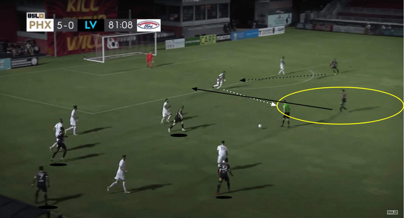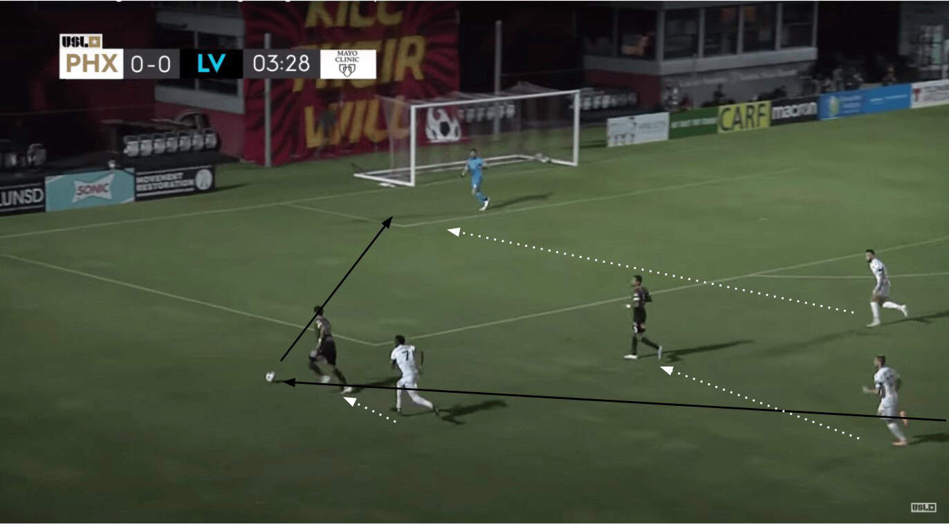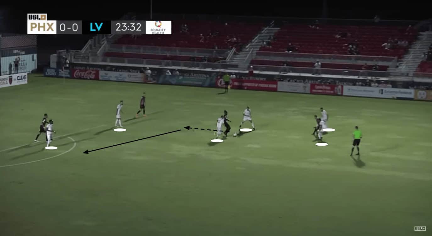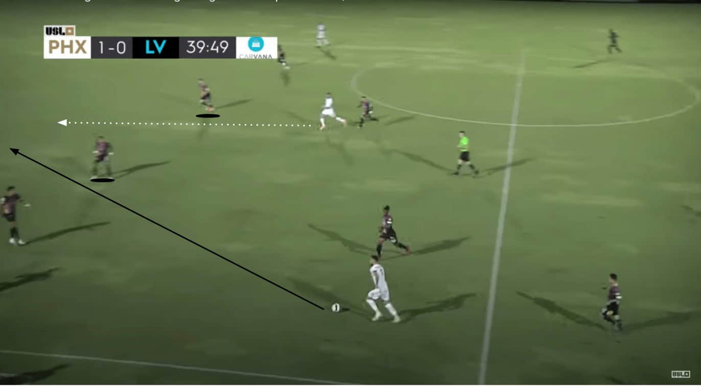 Las Vegas really struggled to get anything going in terms of attack against Phoenix. A lot of these struggles occurred because of their insistence upon them building from the back. When they weren’t trying to progress up the pitch with their possession, they would have to win multiple aerial battles in order to find themselves in the opponent’s half. Even when they did, they were unable to execute well enough to create too many solid chances for themselves. What did seem to work against Phoenix’s relentless defensive effort was attracting pressure to overload an area in order to isolate an individual in a 1v1 situation.