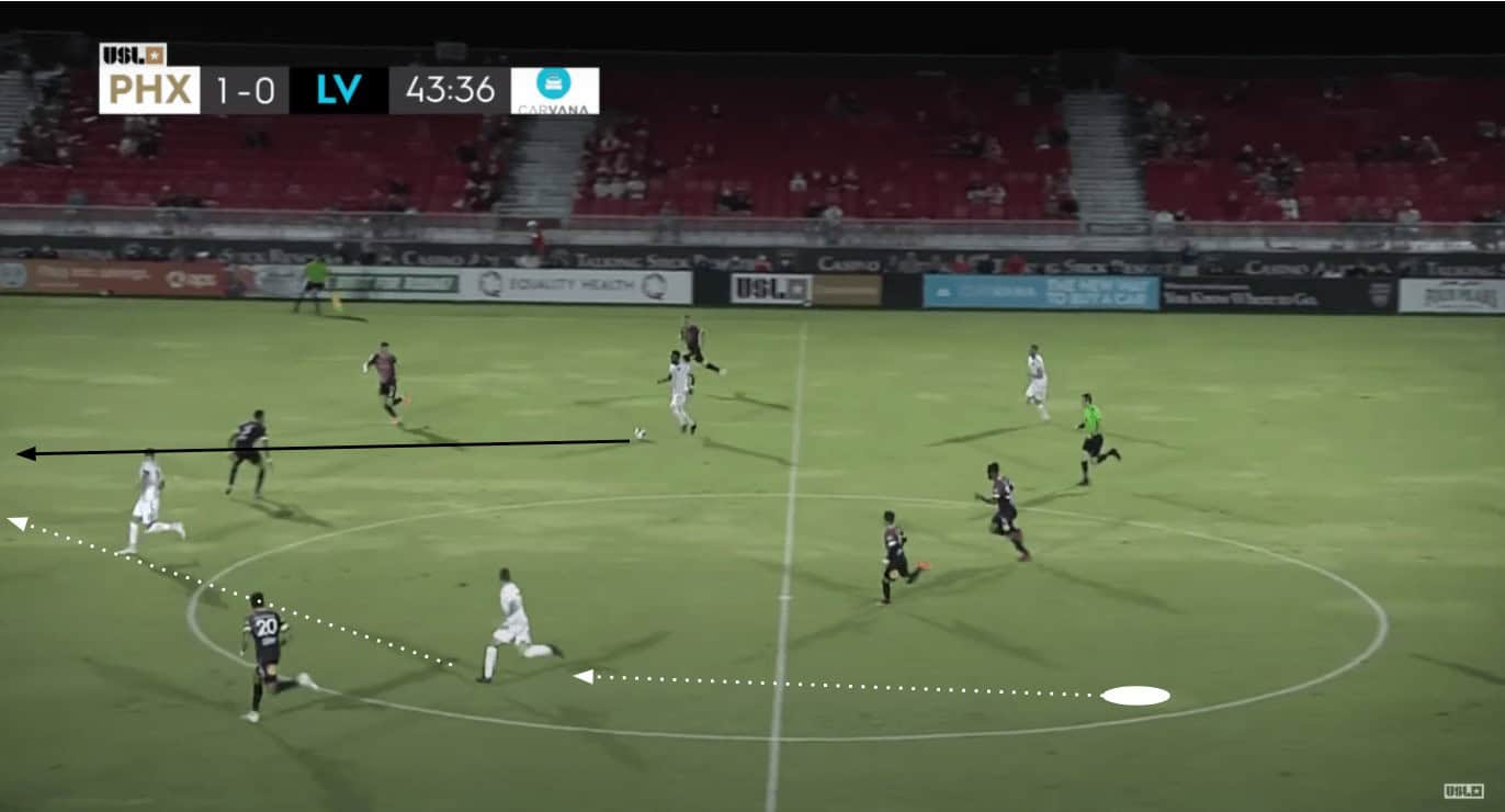 While Phoenix was unsurprisingly able to take advantage of their transitions, they also did well to make runs from their midfield in behind the defence. These runs from Stanton and Bakero were largely unmarked and caused Las Vegas a lot of problems with their defensive organisation.