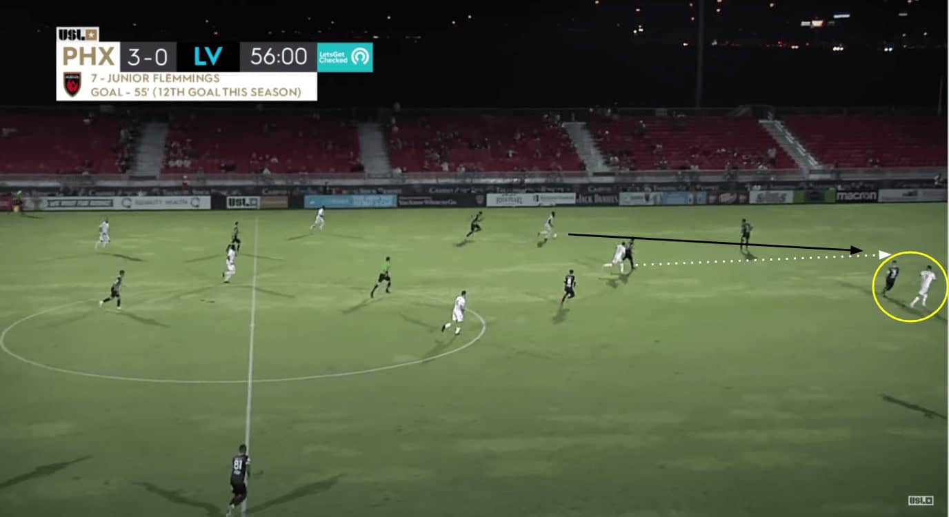 Phoenix found themselves up 3-0 after some individual brilliance from Junior Flemmings. Seconds later, they scored again after a great run from Stanton in behind. The goal started with Dadashov and his positioning between the two centre-backs. The right centre-back felt like he needed to cover him closely, creating a large gap between himself and the right-back. Stanton exploited this gap by getting goal-side of his marker and running in behind. The right-back was frozen because he had to decide if he should mark Flemmings or protect the inside of the pitch. At that point, Flemmings was able to find Stanton in stride, putting the ball on his foot with a brilliant pass. Stanton used his first touch to control the ball and his second to bury the chance, ending any hope for a Las Vegas comeback in the process.