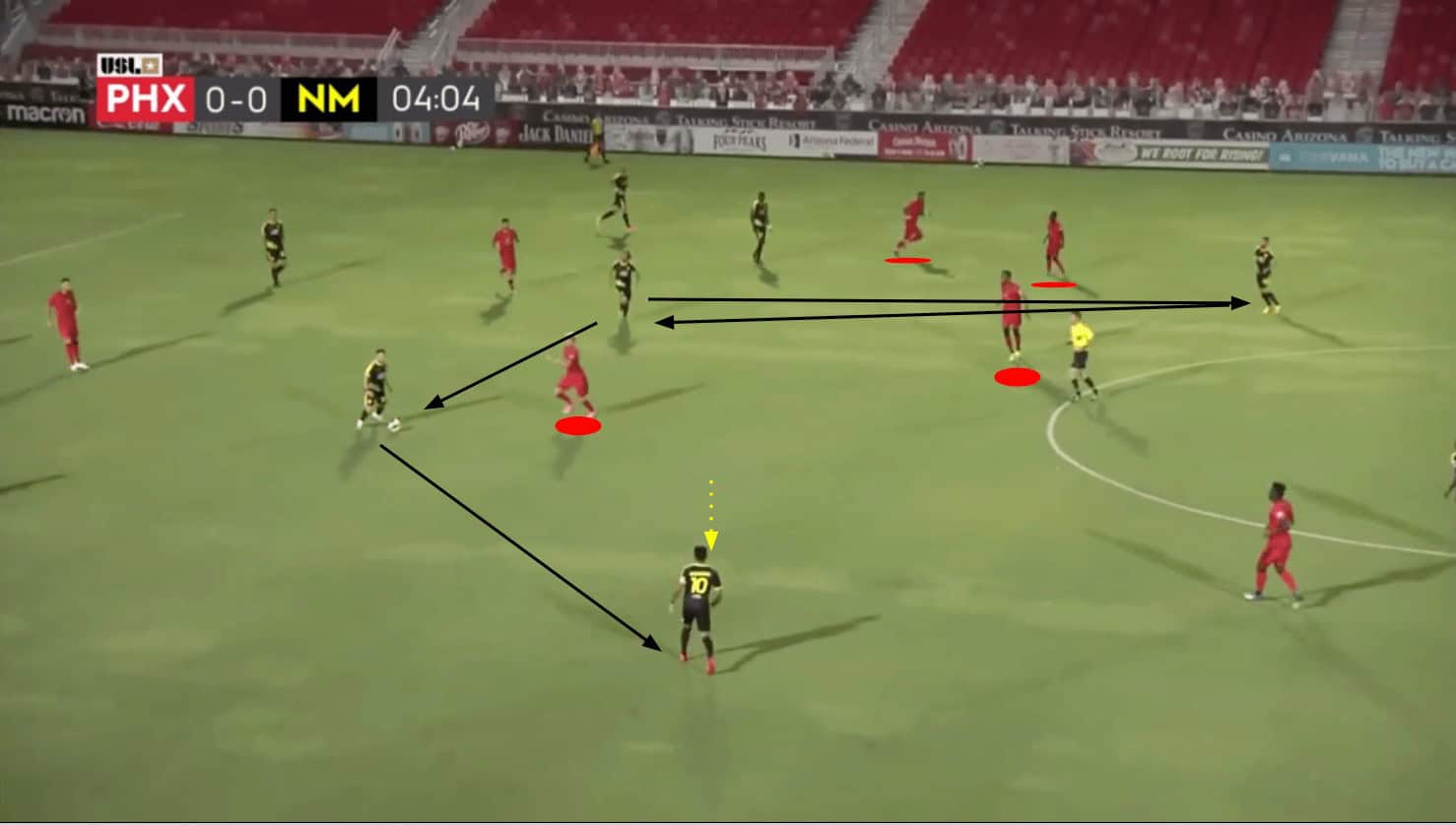 In the instance below, New Mexico attracted pressure in the centre of the pitch during their build-up. This created more room for them on the flanks, where they could look to get in behind Rising’s full-backs before getting a cross off.