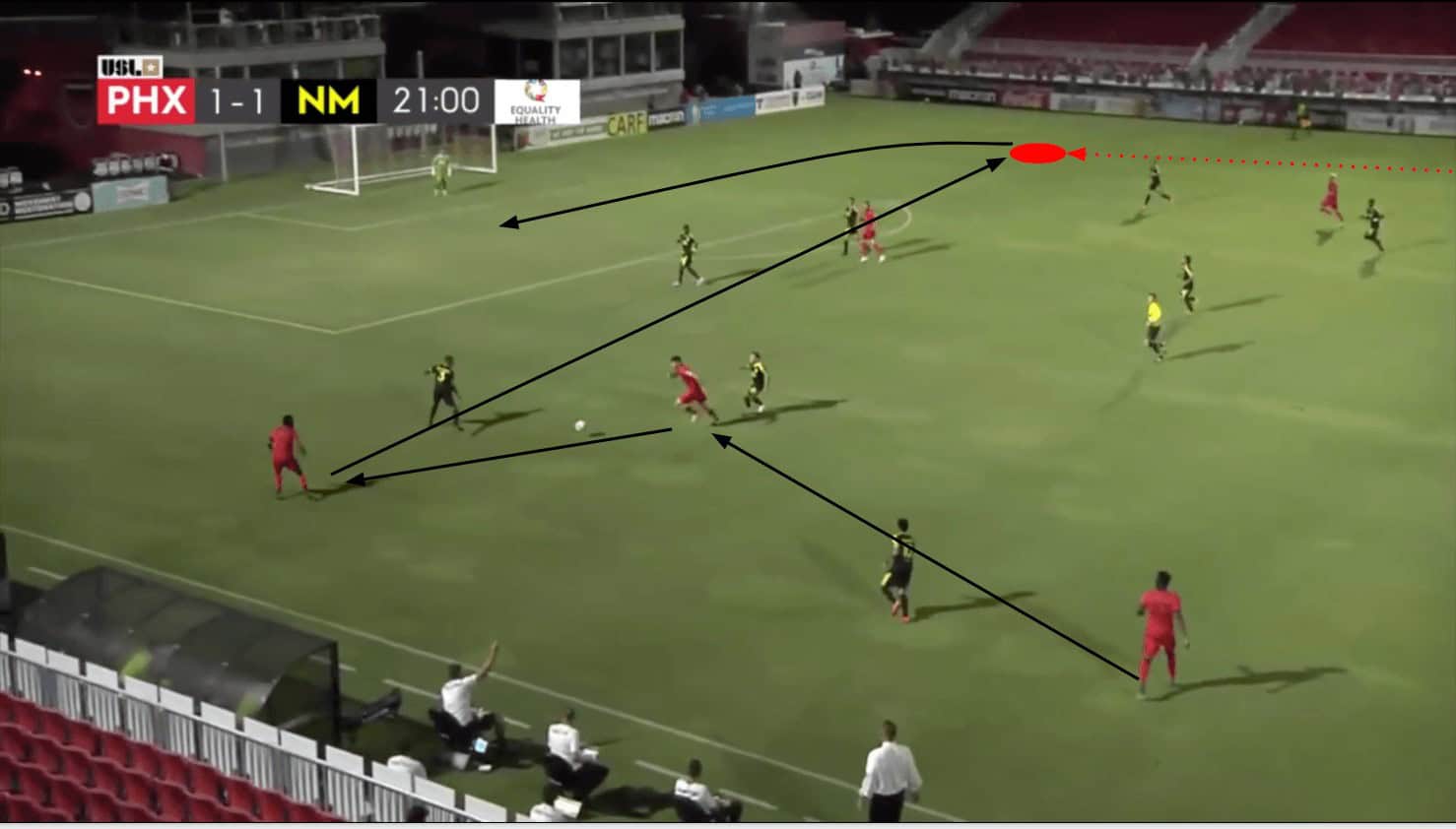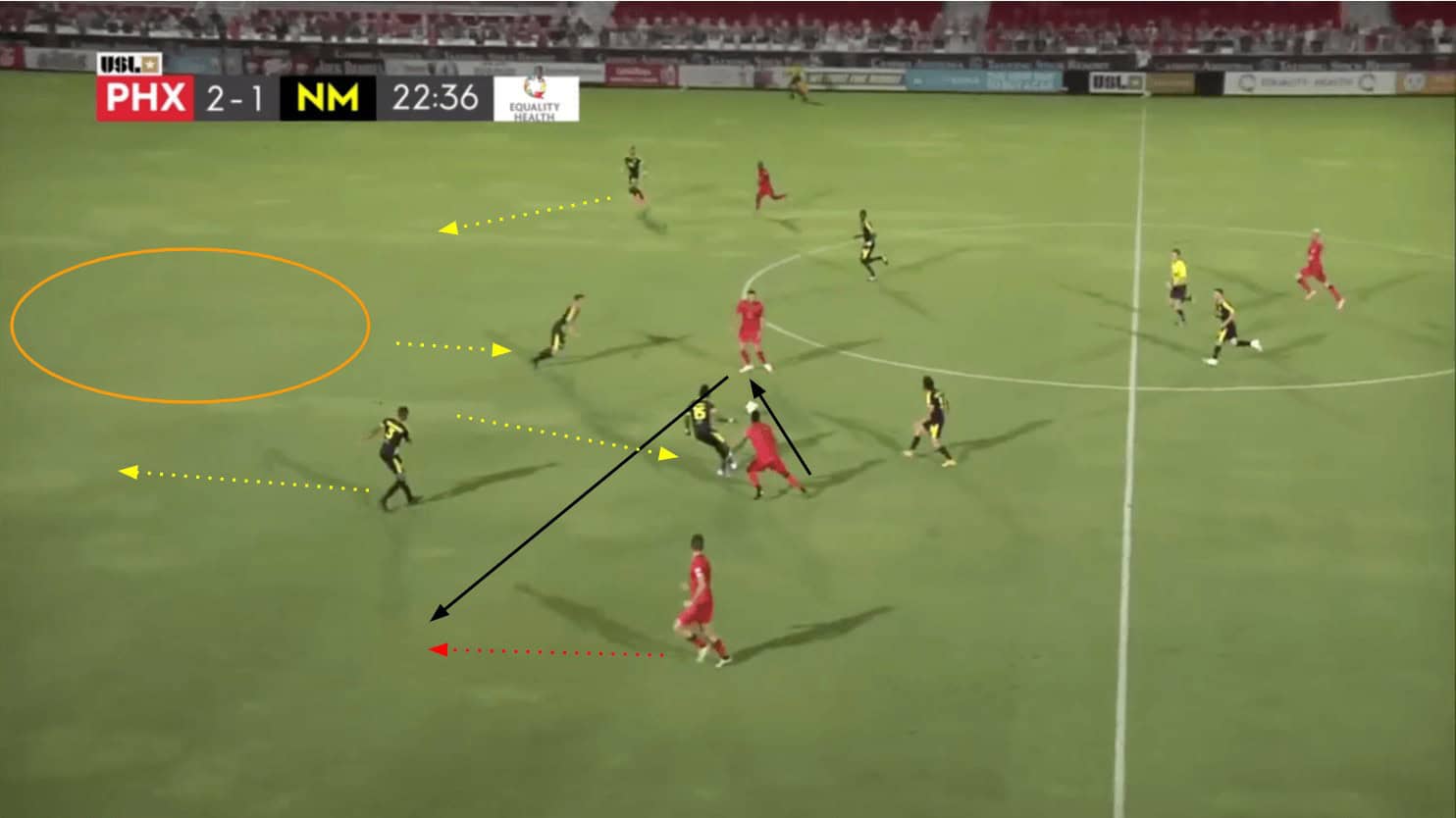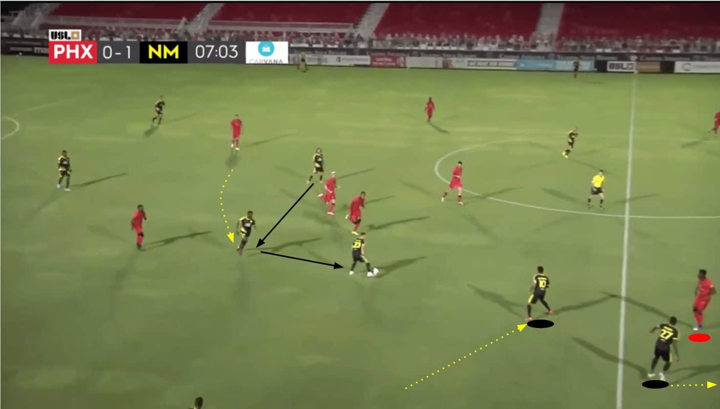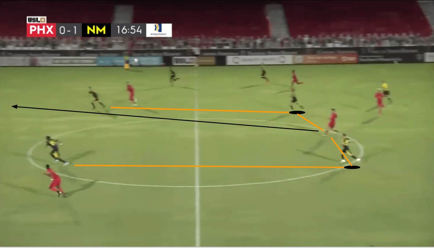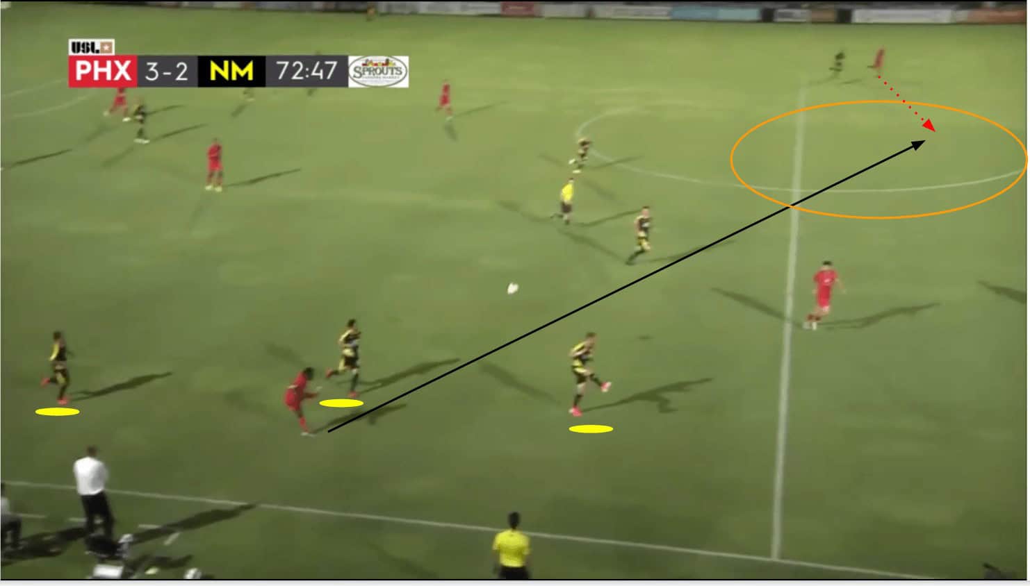 Again, Phoenix used a vertical pass to immediately put New Mexico under pressure. Flemmings and Dadashov combined to find Bakero open as the free man running into space. Because both of the New Mexico centre-backs had stepped up to pressure, their outside-backs had to pinch inside in order to protect the space they had vacated. As Bakero progressed up the pitch with the ball, New Mexico’s left-back had to close down the centre of the pitch. This allowed Asante to separate from him by taking a few steps backwards. Bakero was able to find Asante, who was able to get a shot off from his weaker left foot, which ultimately rolled to the goalkeeper. That being said, it was clear that New Mexico was rattled with all the shifting and covering that their defenders had to do. And as Rising had proven during the previous play, the longer this happens, the more likely defenders are to make mistakes and get punished for them.