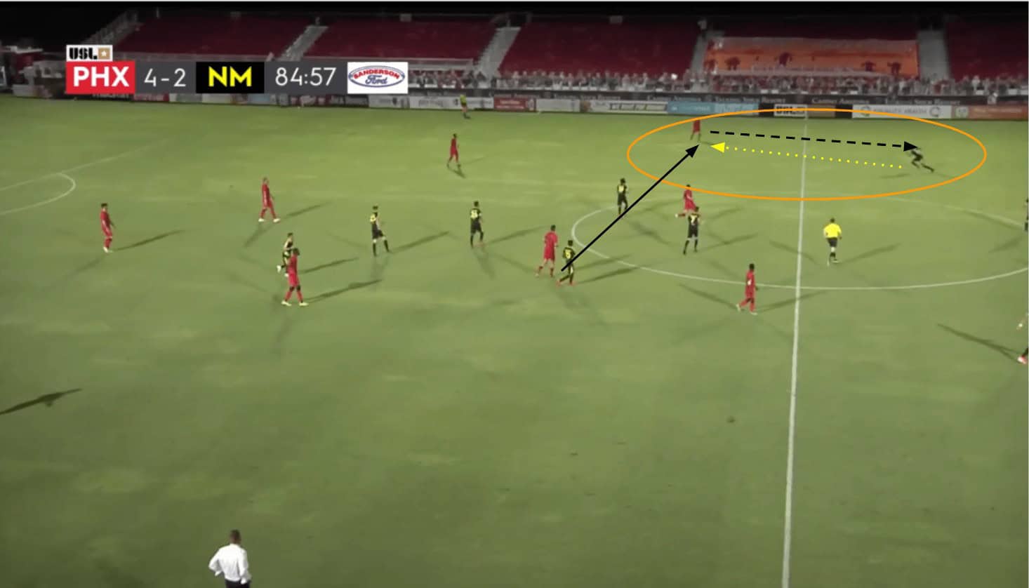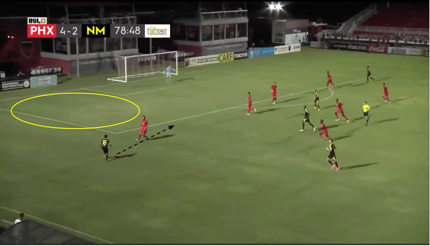 New Mexico’s nightmare continued in the 85th minute when Bakero found Moar on the wing in his own half, just seconds after Phoenix had won the ball and successfully played through New Mexico’s first wave of counterpressing. New Mexico’s right-back provided way too much room for Moar, who used his first touch to go past the defender.