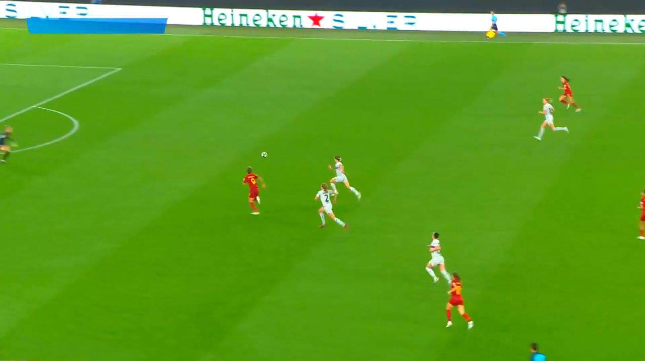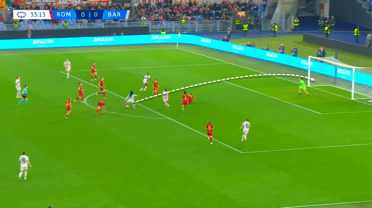 From an attacking perspective, Roma will have to rely more on Giugliano since she is the playmaker of the team and both strikers will need to be much more decisive in front of goal. One of the most dangerous Roma occasions in the first leg took place thanks to an excellent Giugliano long pass at the back of Barcelona’s defensive line, reaching Giacinti in a perfect position. The only issue was that Giacinti failed to reach the ball before the goalkeeper who went out to save the opportunity. Nevertheless, Giacinti could have done more to touch the ball before the goalkeeper since she had the advantage at first, as it is shown below.