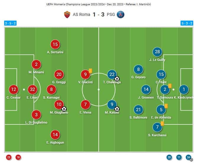 Alessandro Spugna opted for the 3-5-2 for this match, and it appeared that this formation did not really help Roma effectively resist or win against PSG. He used Camelia Ceasar as a goalkeeper, Lucia Di Guglielmo, Elena Linari and Moeka Minami as centre-backs, Saki Kumagai as a defensive midfielder, Manuela Giugliano and Giada Greggi as central midfielders, Annamaria Serturini and Eseosa Aigbogun as wingers while Valentina Giacinti and Evelyne Viens formed the attacking duo.
