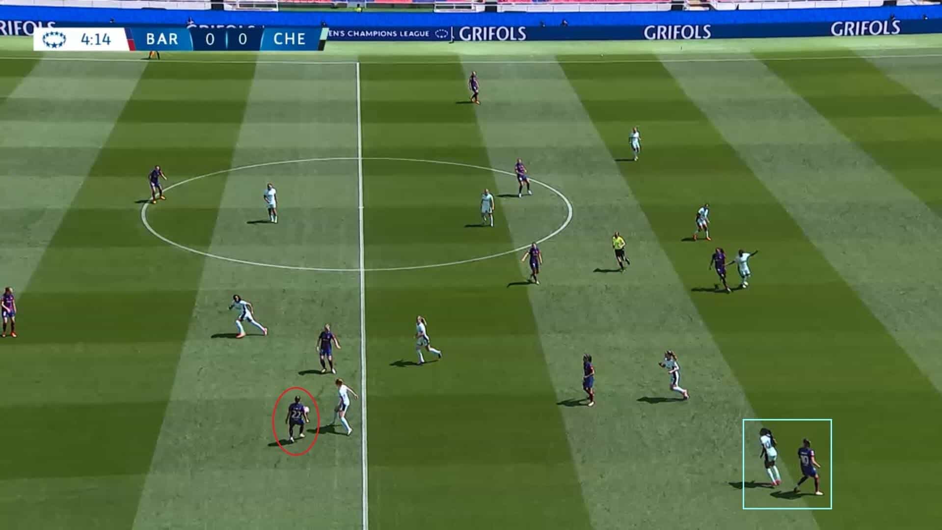 With all of this in place, Guijarro now has the ball at her feet on the far side of the pitch, but with no teammates available for her to pass to, and the fact that Carter was moving to close her down meant that she couldn’t just hold her position and wait for one to become free either. As a result, she was forced to pass backwards here, and Barcelona needed to build again and the fact that this happened several times in the first half means that it played a major role in Chelsea preventing their opponents from getting into their usual flow.