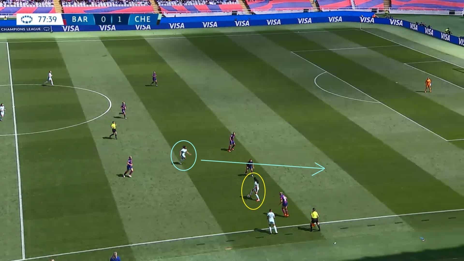 This was largely facilitated by Chelsea starting Ramírez at the top of the field, with the Colombia striker having the type of profile that unsettles opposing defensive lines, and her presence and ability to both hold the ball up and to run in behind gave the Barcelona back line a torrid time. Her tendency to play on the shoulder meant that they were forced to split from the midfield whenever they didn’t have the ball, with that fissure then being exploited by the midfielders.