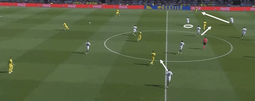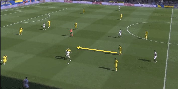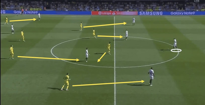 In the above picture we see a Valencia centre-back on the ball, Villarreal are happy to let him have possession in his own half and instead focus on cutting out the passing lanes to advance the ball through the lines. Villarreal drops their strikers back into their own half in line with the wingers (ready to shuffle across if the ball is moved to one of the full-backs) but don’t close down the player on the ball, instead keeping their shape and effectively man-marking all available options.