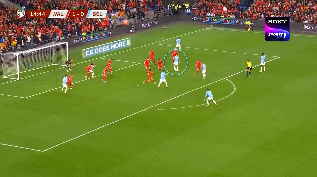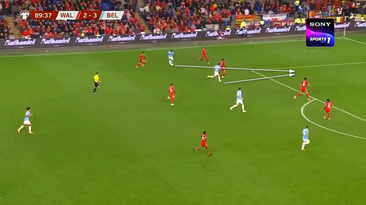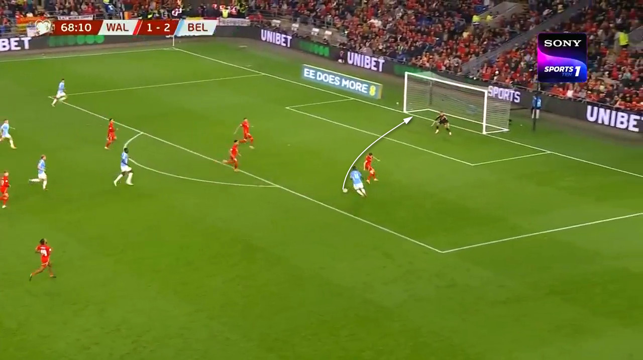The second goal action highlights Meunier’s attacking support and Belgium’s wide array of solutions for goalscoring, as Meunier came from behind and advanced quickly to receive Doku’s excellent pass and shoot with power and accuracy inside the net, exploiting the space left within Wales’ box.