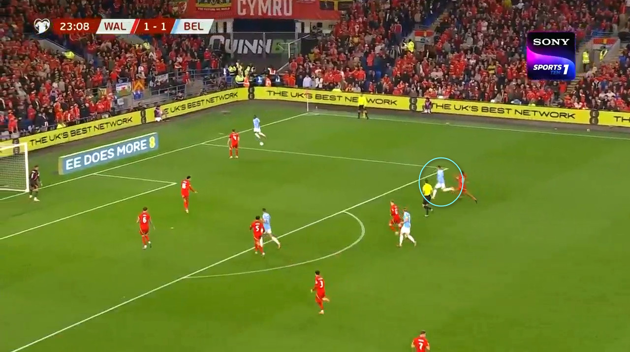 In fact, De Ketelaere gave a hard time to Wales’ defenders mainly because he kept moving intelligently between the lines and dropping to create spaces for the players coming from behind or from the wings.
