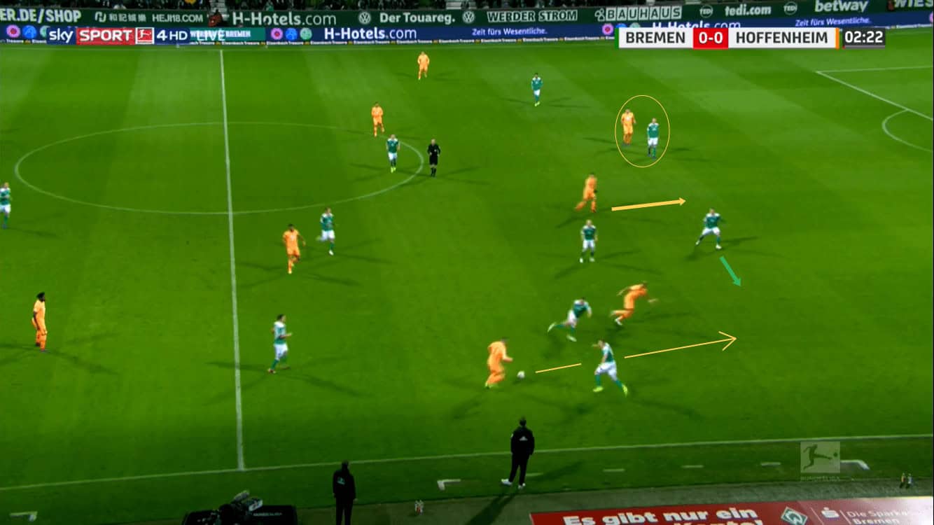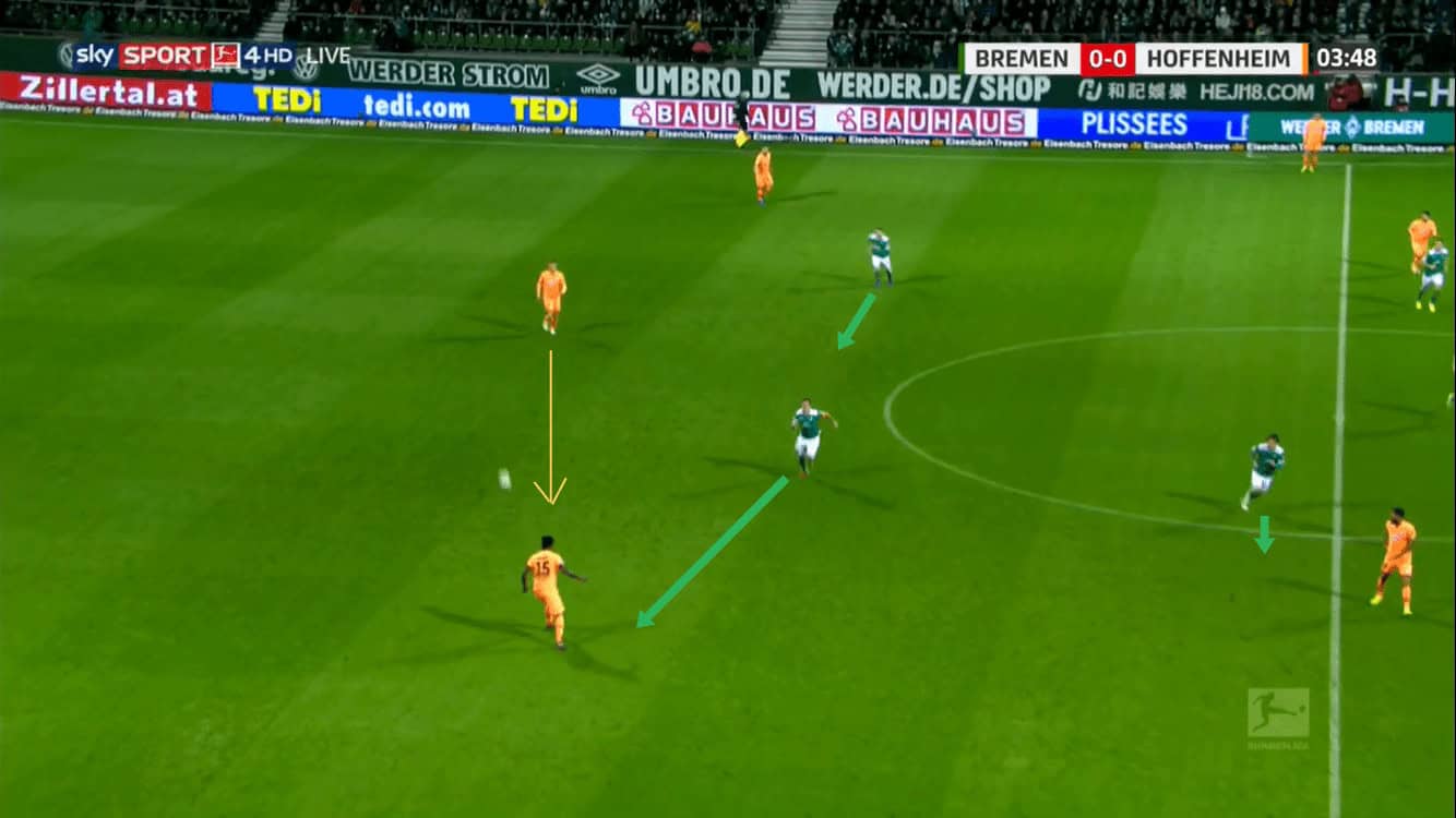 As a possible solution in order to bring in more variety, Hoffenheim’s central defender could have disorganized Werder’s patterns with continuing to dribble towards the opponent’s half. At some point, someone would have had to press him which would have opened space for another player. If Osako would have pressed him for example, it would have created space for Demirbay to receive the ball in the centre.
