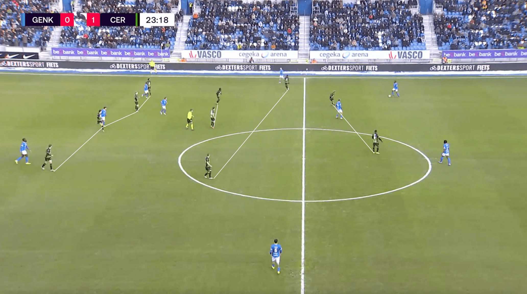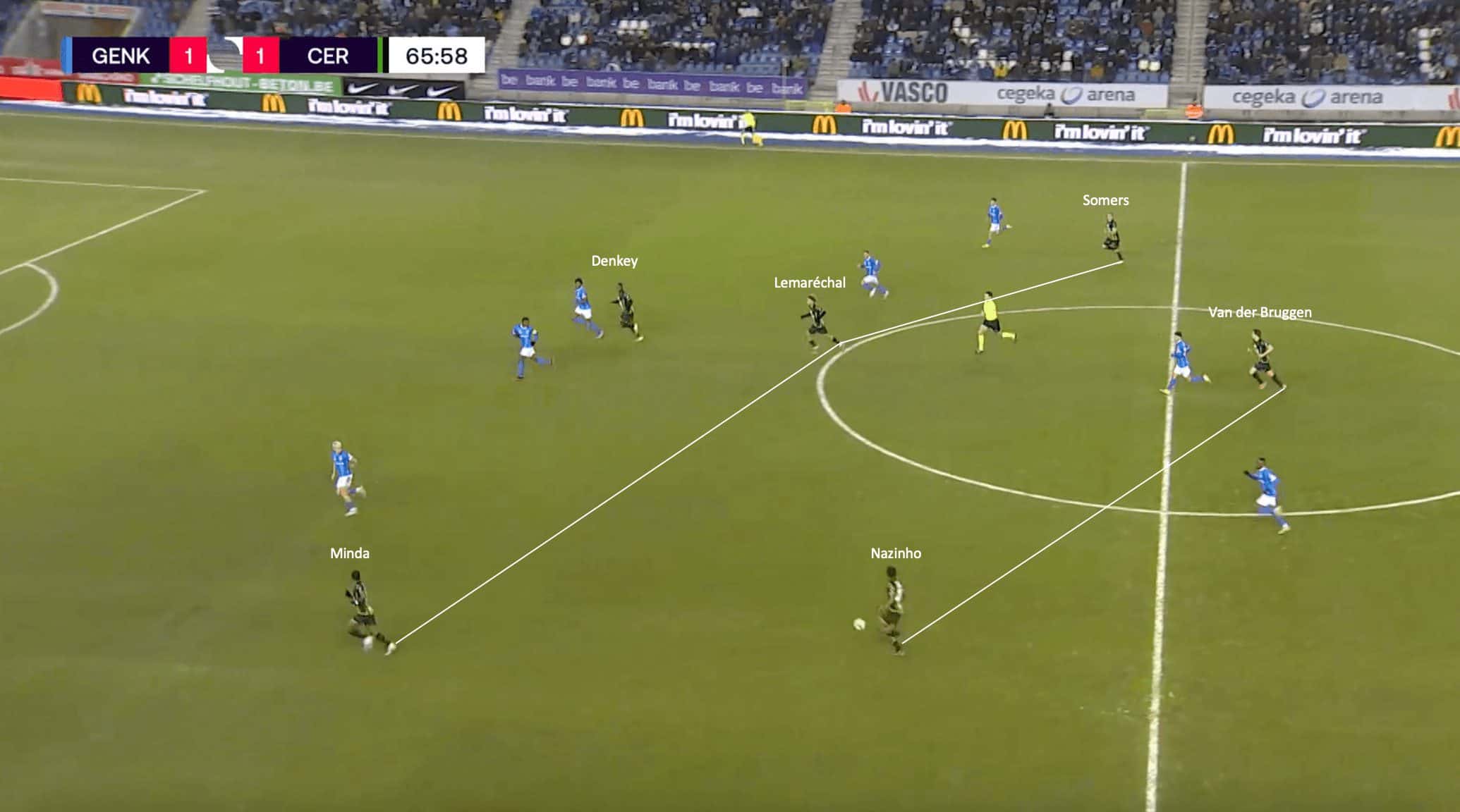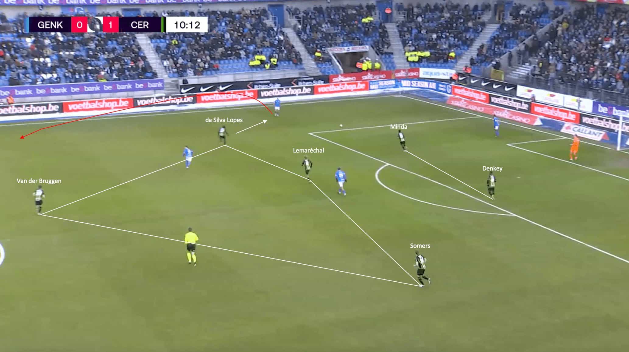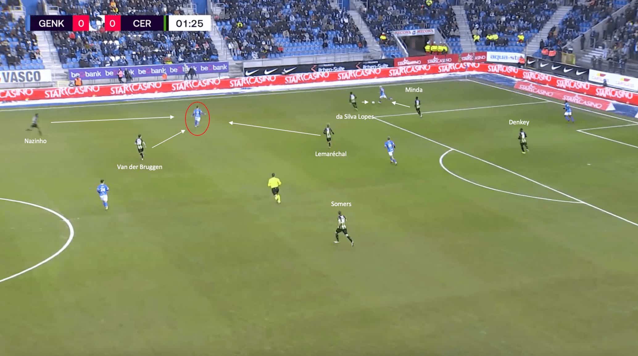 This usually forced Genk to attack down the flanks, much like they were forced to do against Cercle Brugge’s pressing shape.