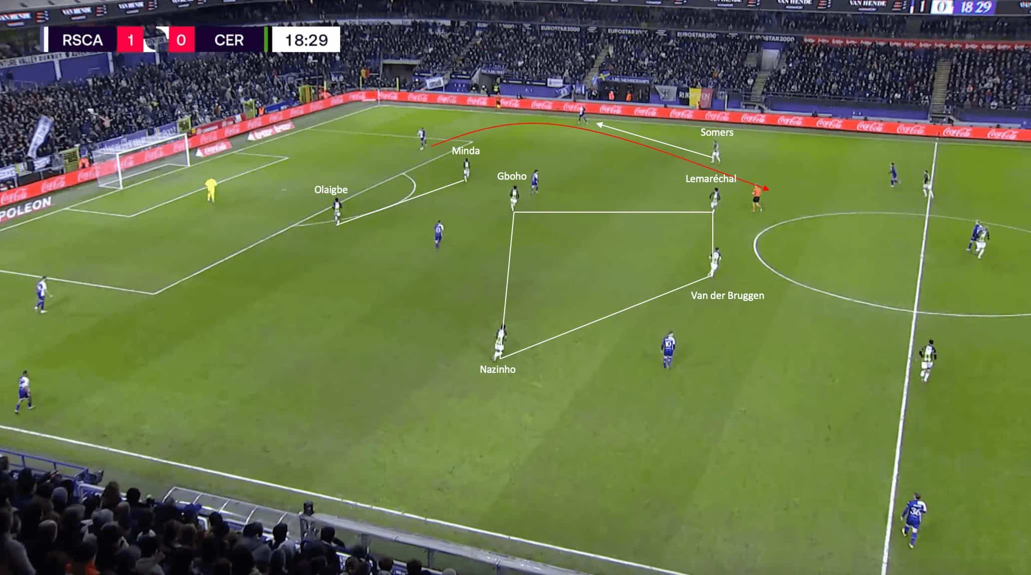 Additionally, Thibo Somers’ advanced movement to occupy the left back forces the centre-back to play the ball long, allowing Cercle Brugge to gather possession and initiate an attacking move.
