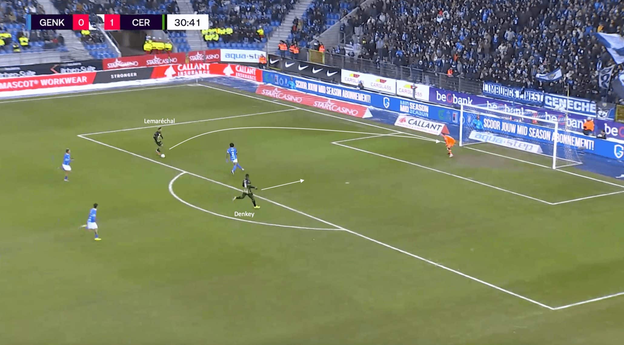 Instead, Lemaréchal takes too many touches on the ball, allowing the Genk defender to begin to close him down and simultaneously eliminate the passing lane towards the Togo international striker, with Denkey forced to slow down, eliminating his momentum in the process.
