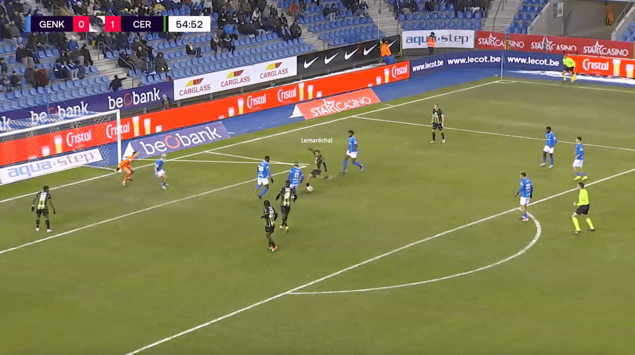 The image above shows another very good chance that Cercle Brugge had to get the all-important second goal in the match against Genk.