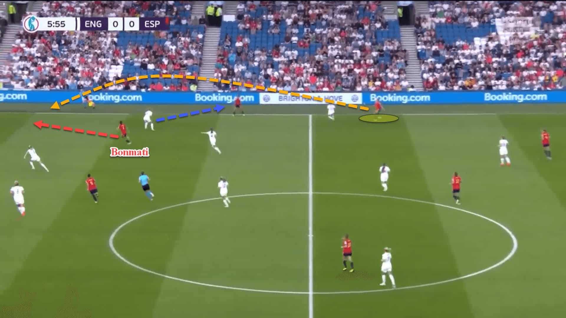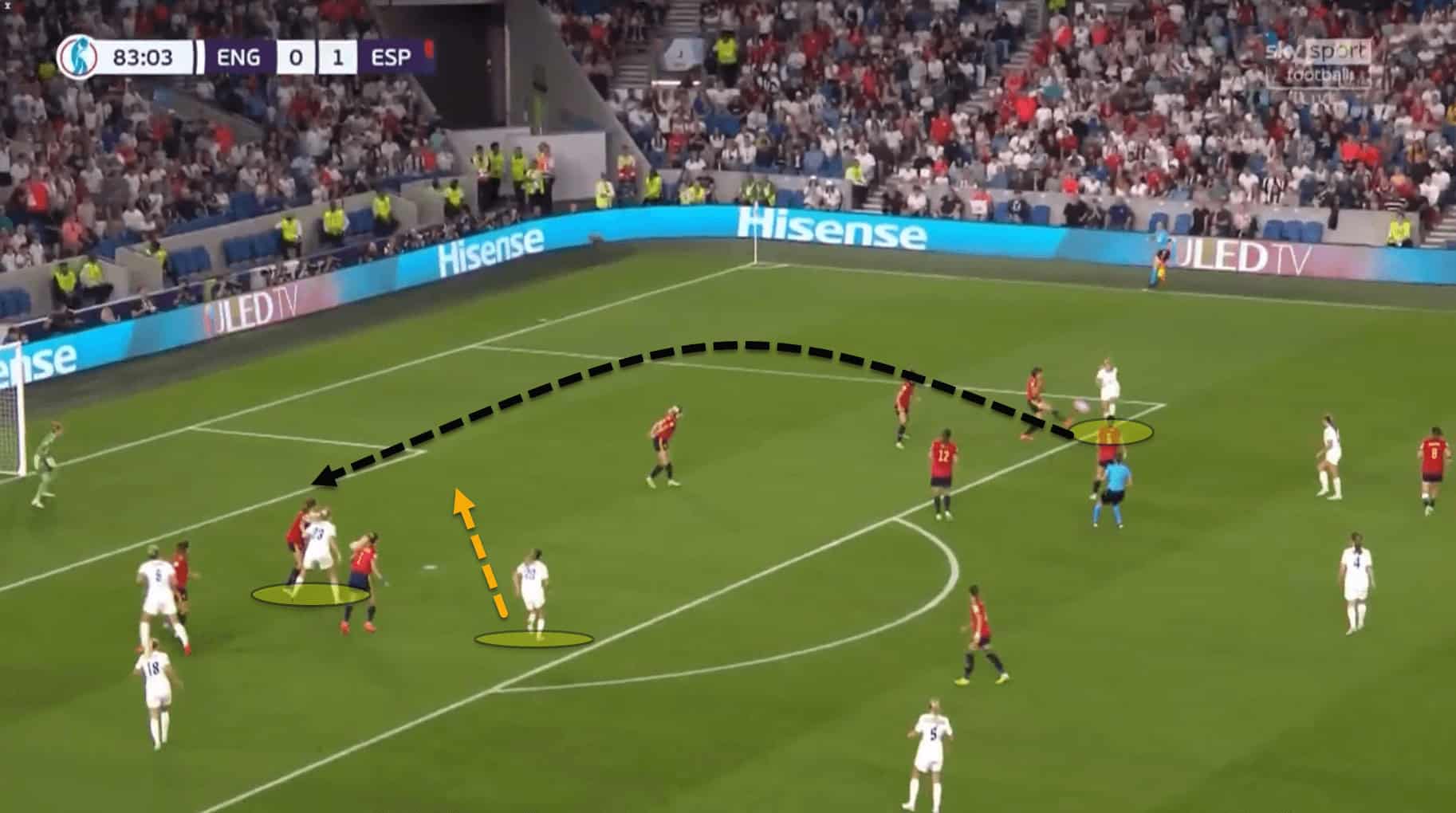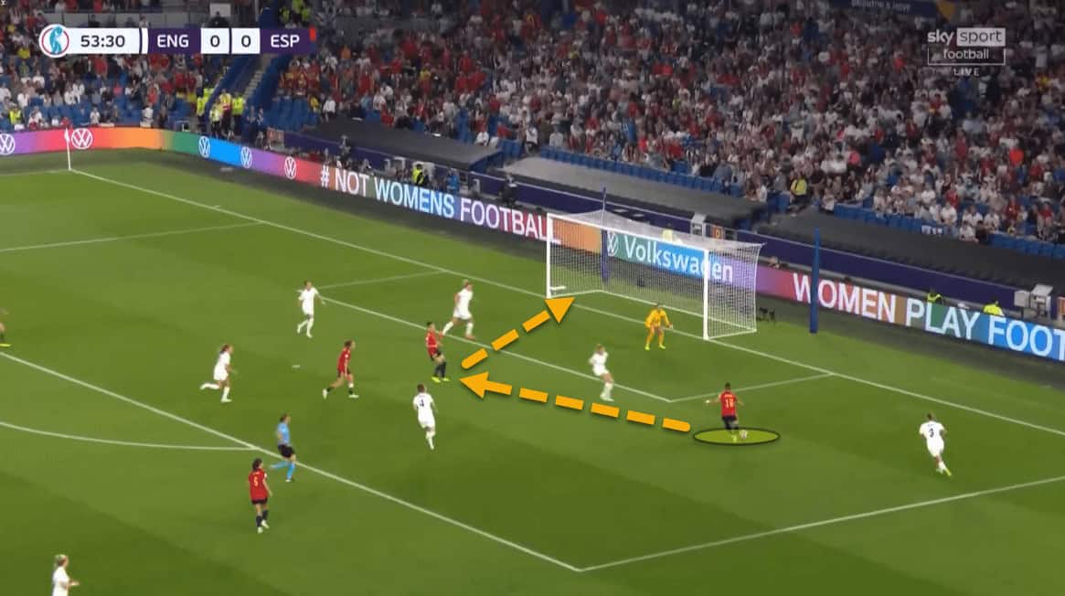 Spain’s pressing was smart. By having Bonmati push higher and sit on Walsh while forcing their play wide, Walsh’s influence on the game was limited and England really struggled to play through the central areas.