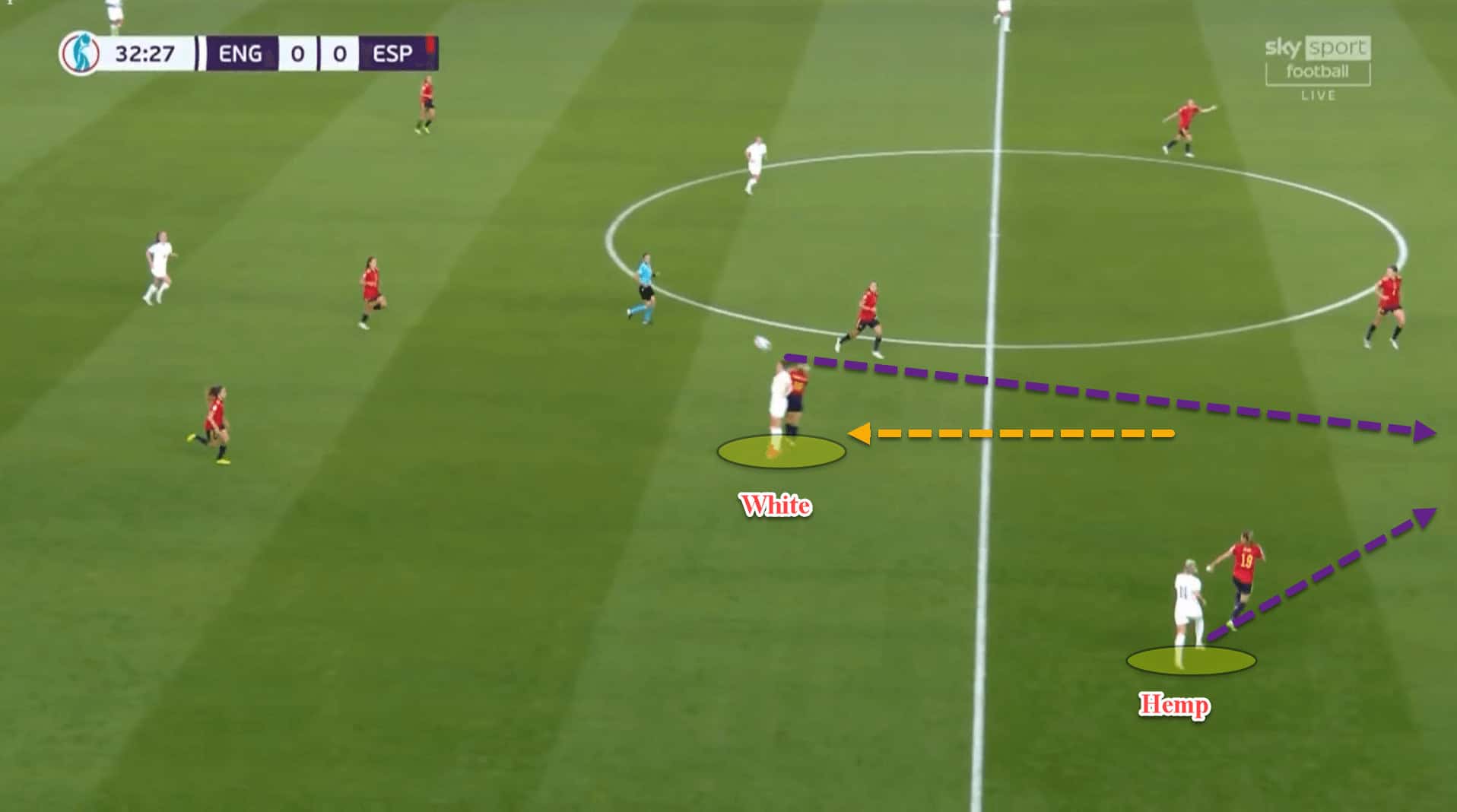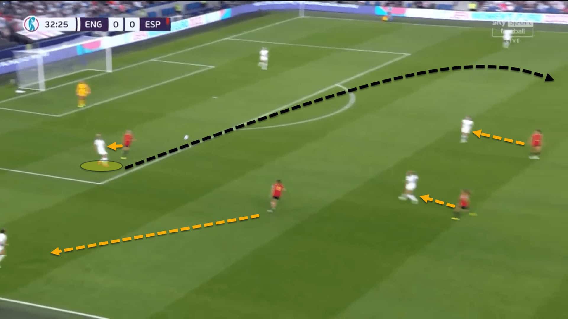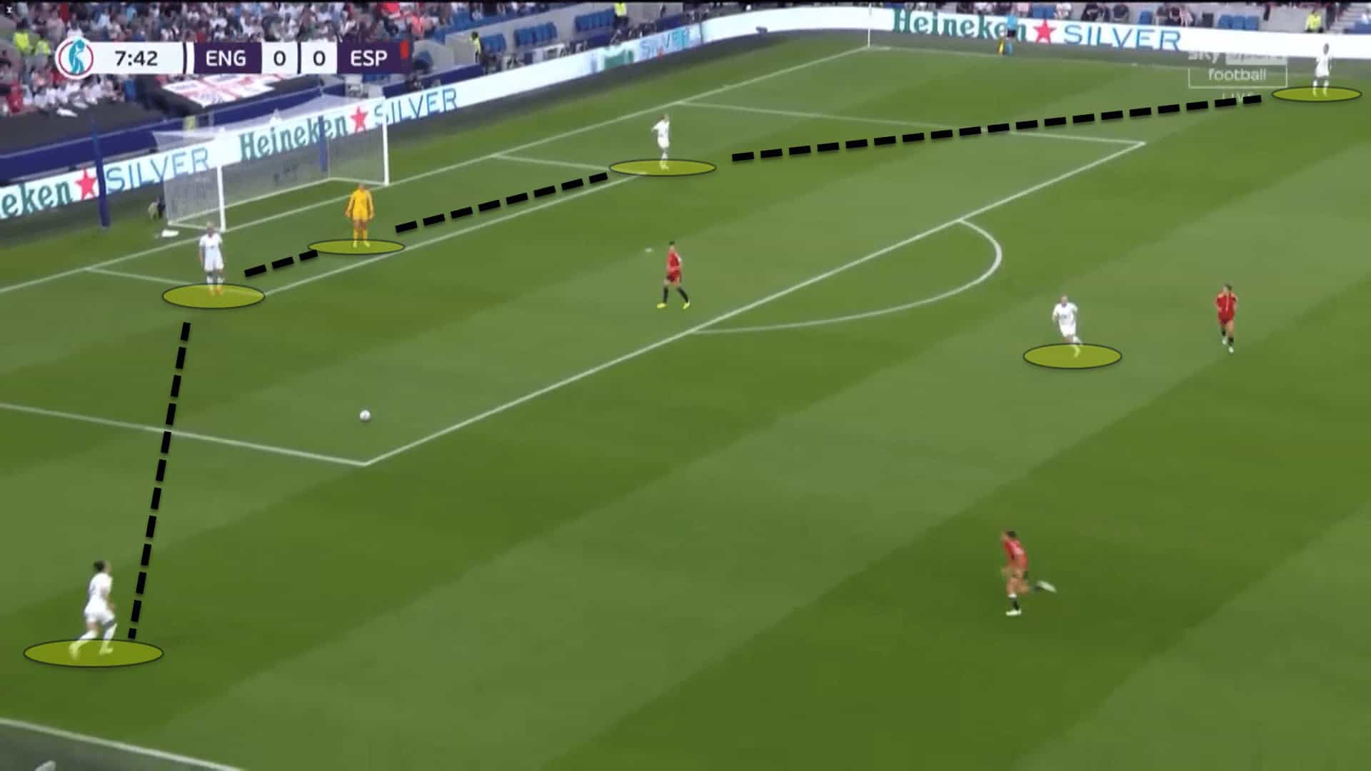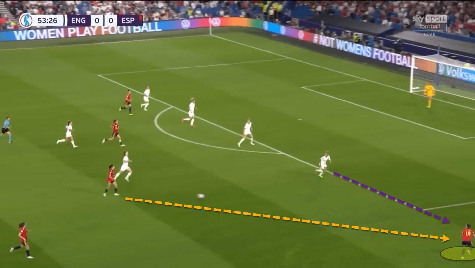 From there, Spain’s pressing application would change. Vilda’s side would switch from a zonal press into one which was player-oriented and very tight to box the English in and use the touchline as an extra defender.