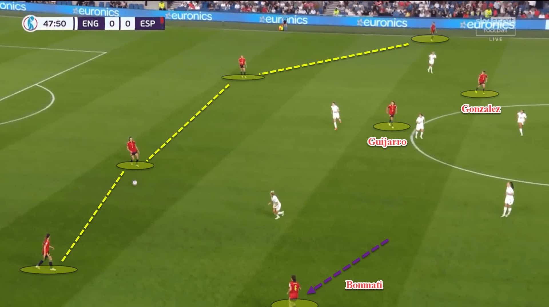 Spain employed their usual 4-3-3 in possession with Guijarro operating as the sole pivot while Bonmati and Abilleira pushed further forward between the lines.