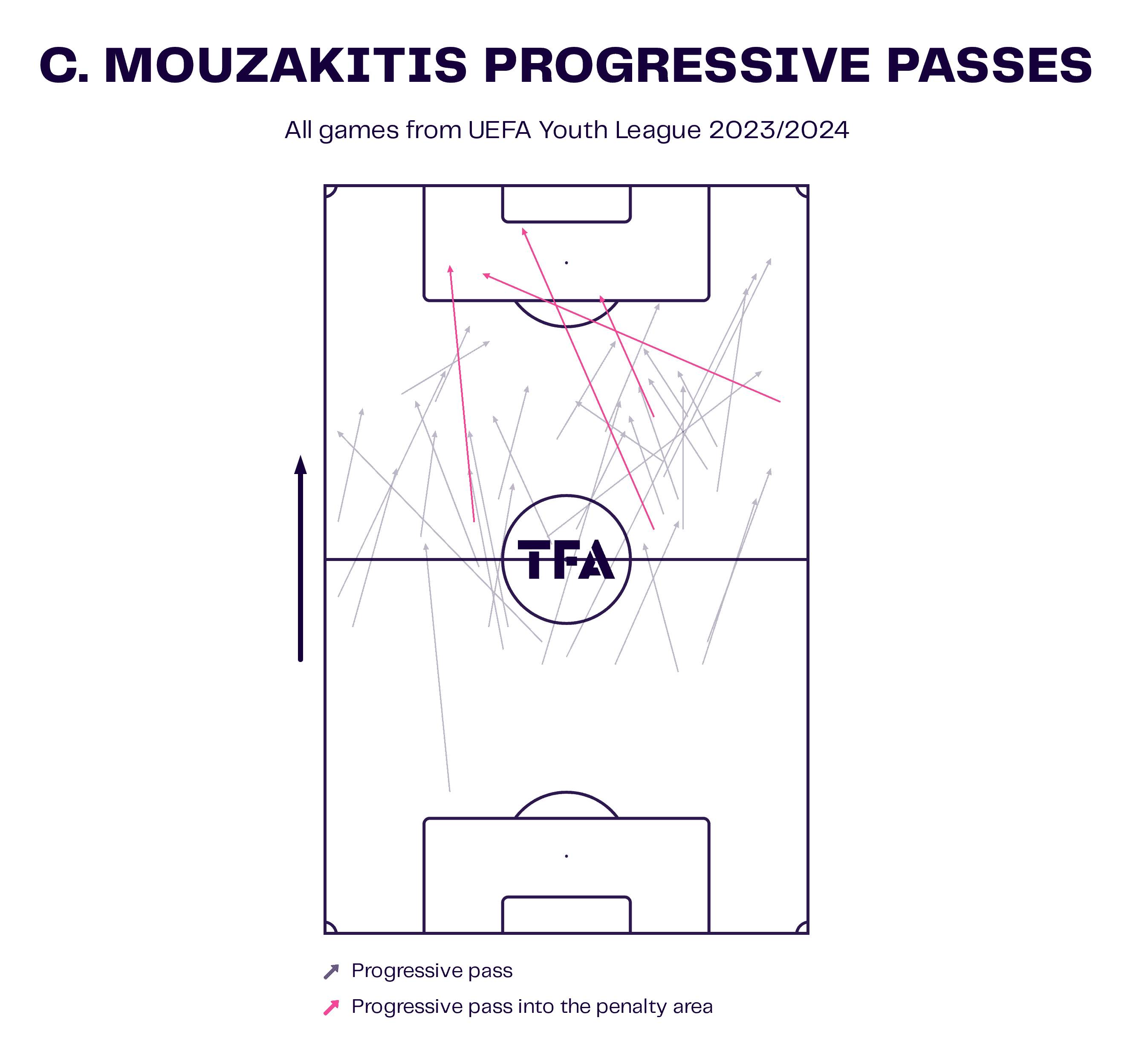 We see his progressive pass map for the current Youth League season in Figure 3, and this illustrates how involved the young midfielder has been for his side in this respect throughout their run in this tournament, averaging 7.11 progressive passes per 90 with an impressive 82.61% success rate.