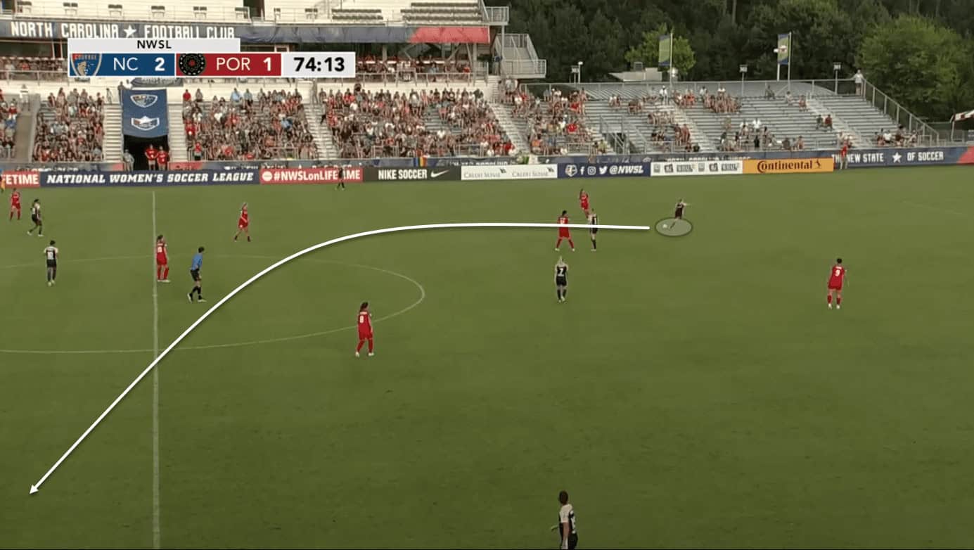 Dahlkemper’s heat map indicates that she is very active outside of the 18-yard box and is not afraid to push up illustrating how high she plays in her teams. This plays a factor in how she’s able to influence her team’s build-up and ability to play more dynamic and risky passes. A lot of her passes for the Courage were longer passes out to the forwards or full-backs. Given their heavy possession style of play, the Courage were afforded space coming out from the back where Dahlkemper was able to play out her trademark passes as the image below shows.