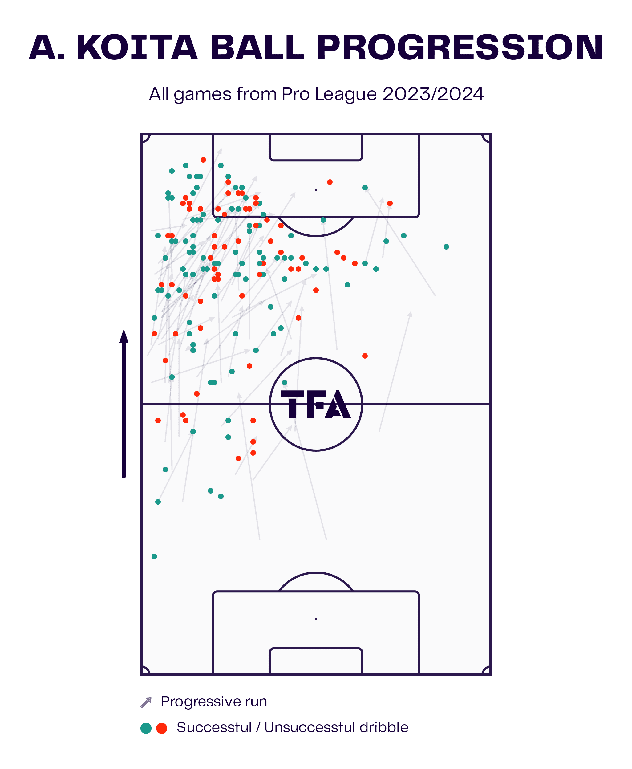The data viz graphic above shows the ball progression of Aboubakary Koita this season, with the figure looking at both progressive runs and dribbles.