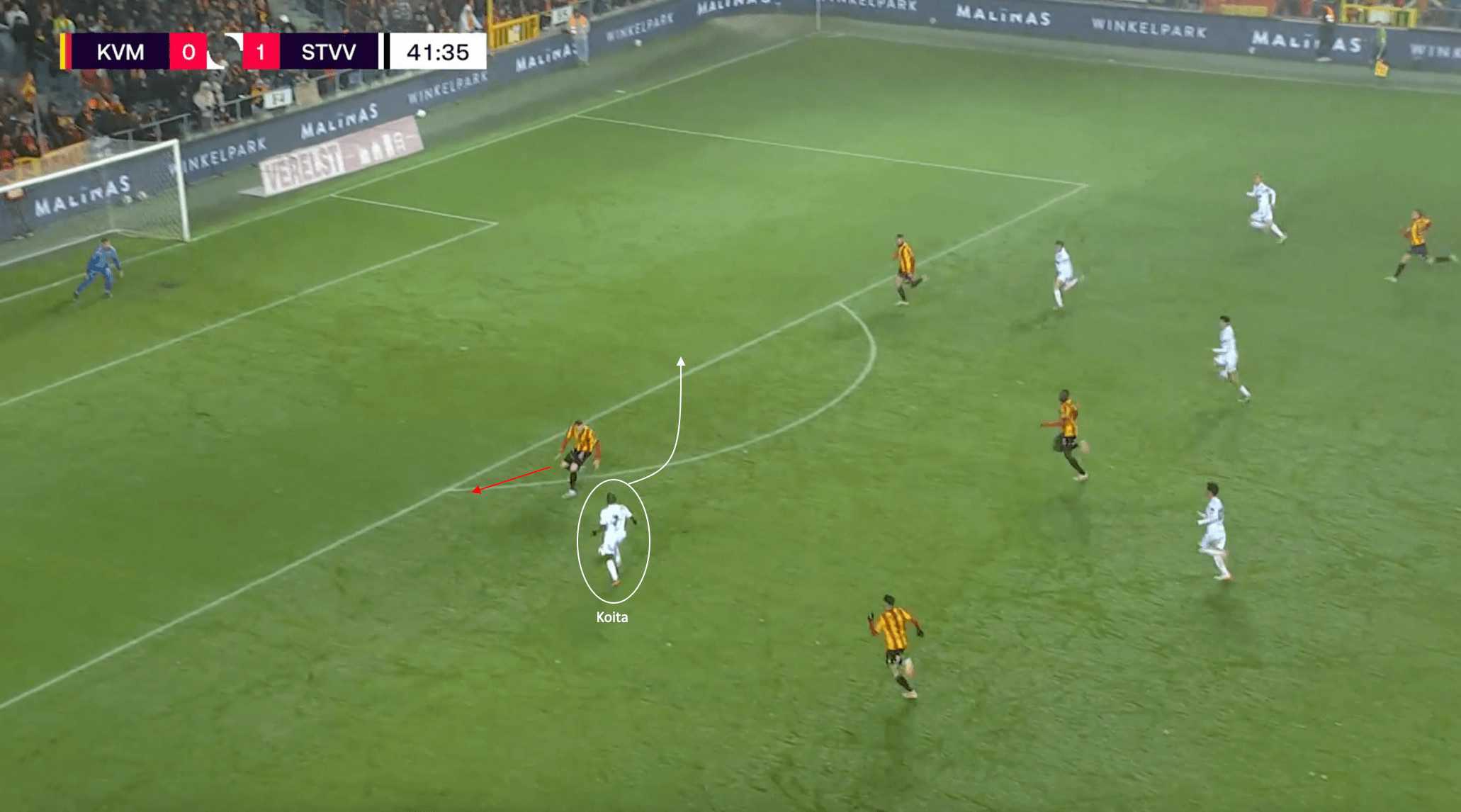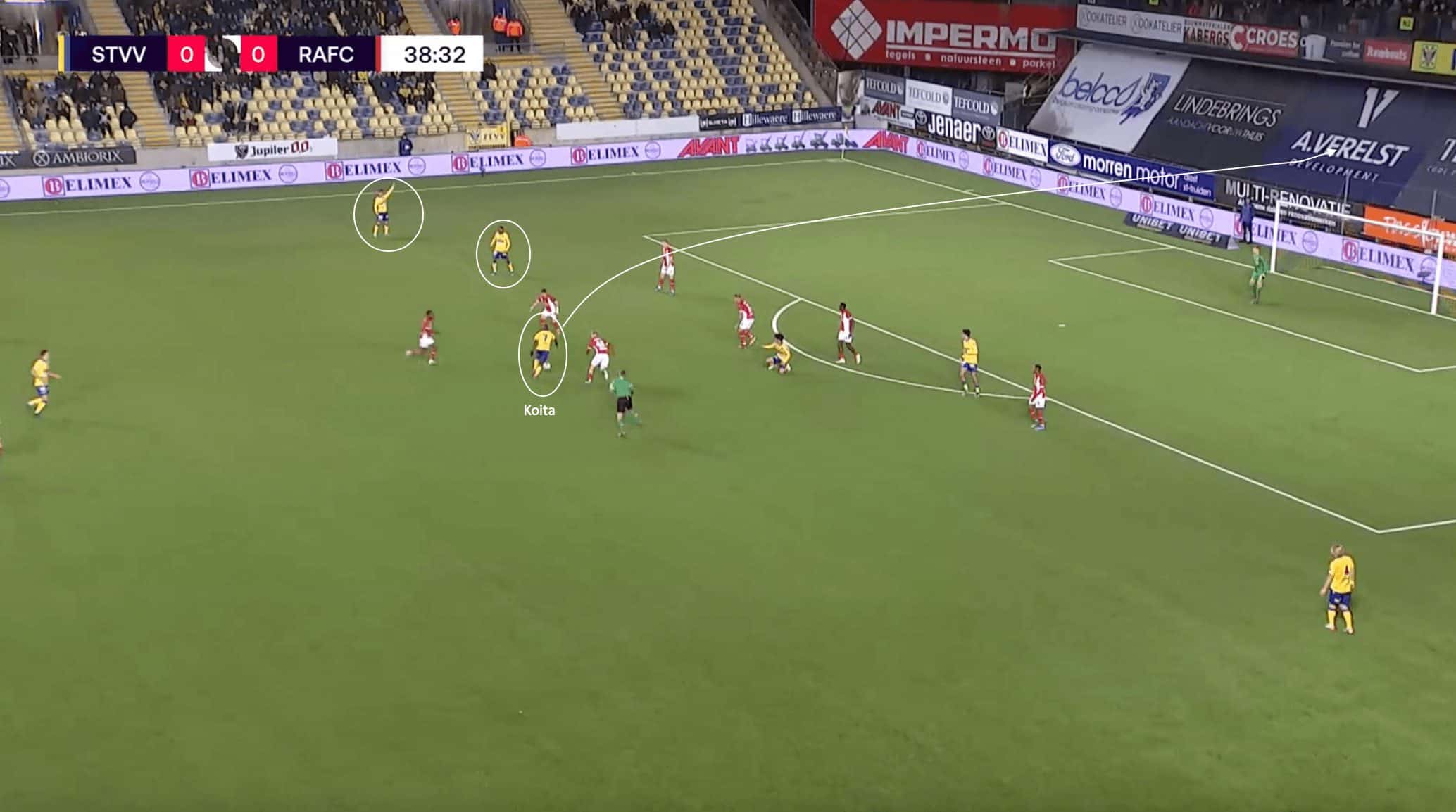 Koita had the opportunity to play a ball into the path of the player closest to the touchline but took too long on the ball, allowing three Antwerp players to surround him and close off the potential passing lane.