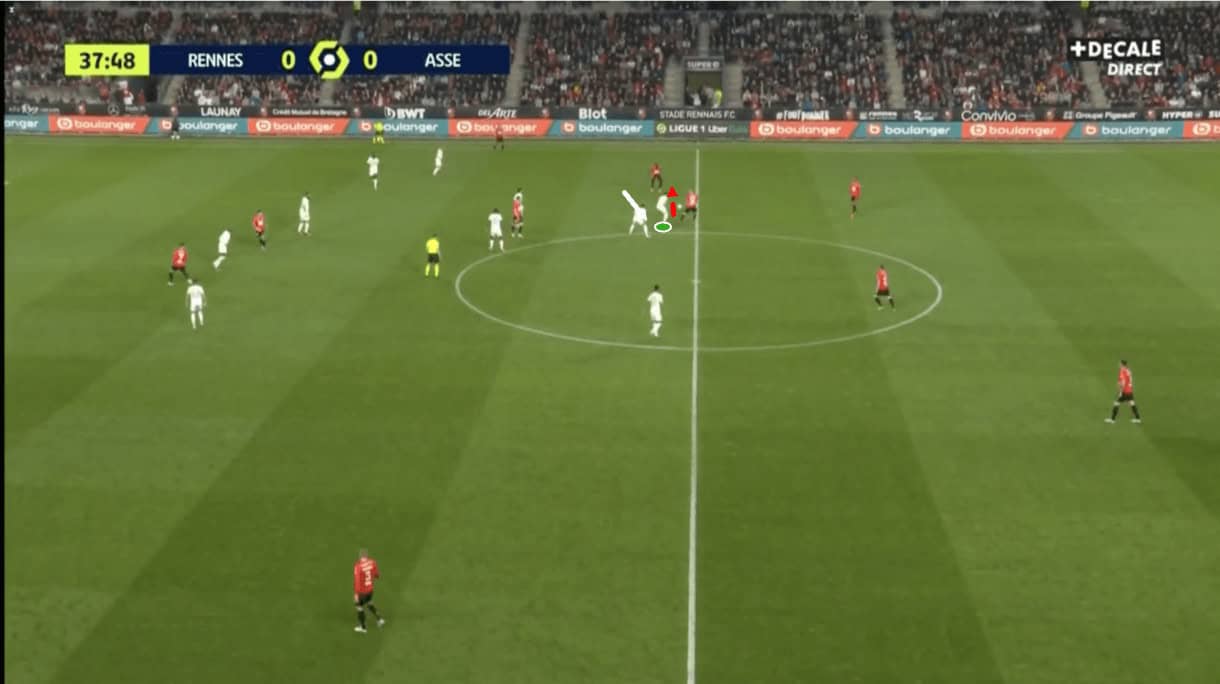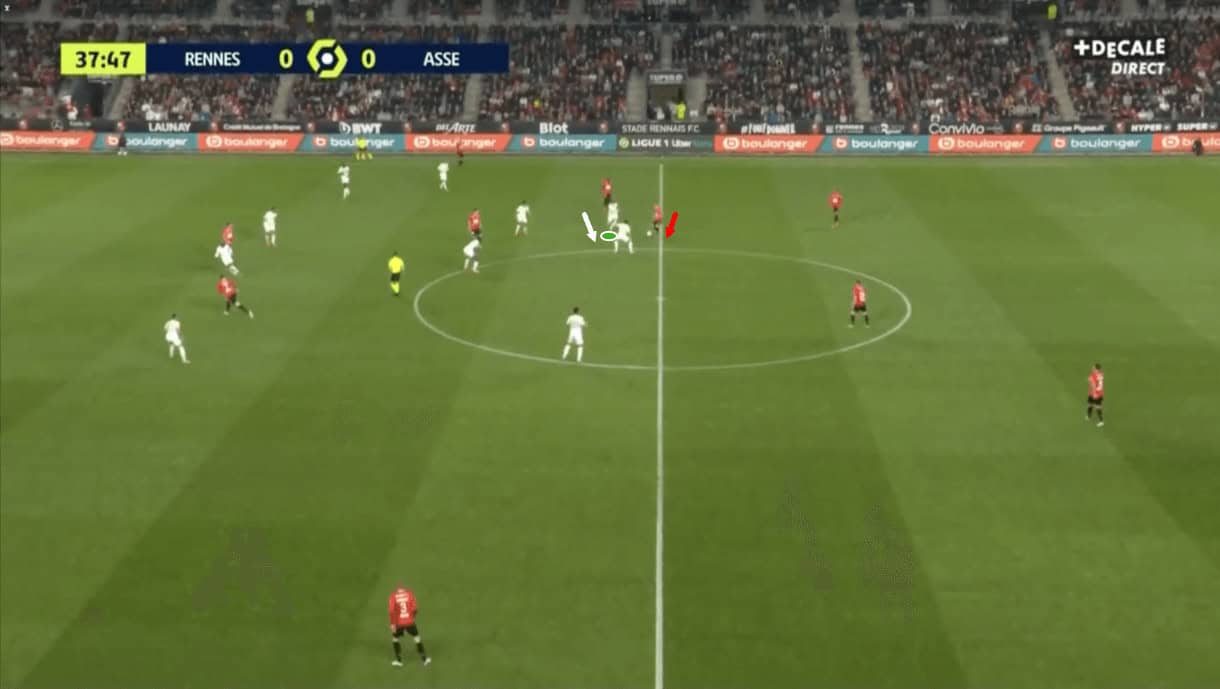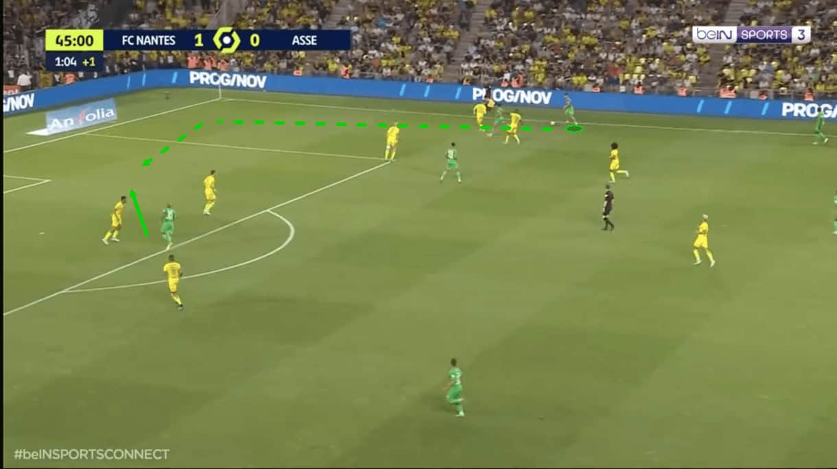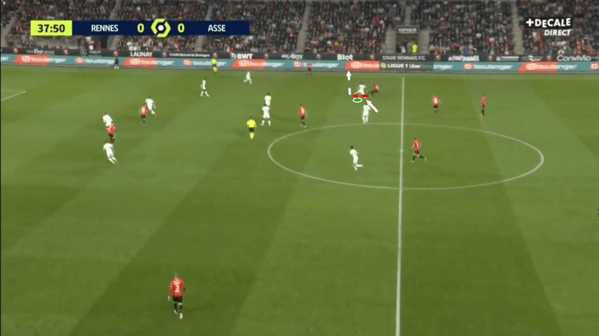 Still, after this, they are forced to protect the ball by the sideline by Saint-Étienne players, who take the opportunity to gain some territory and put the opposition in a vulnerable position through their pressing.