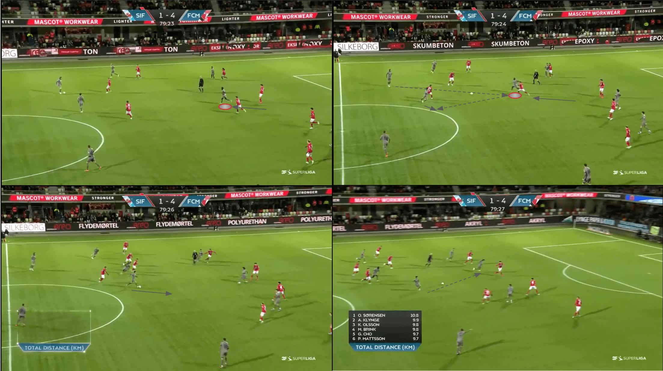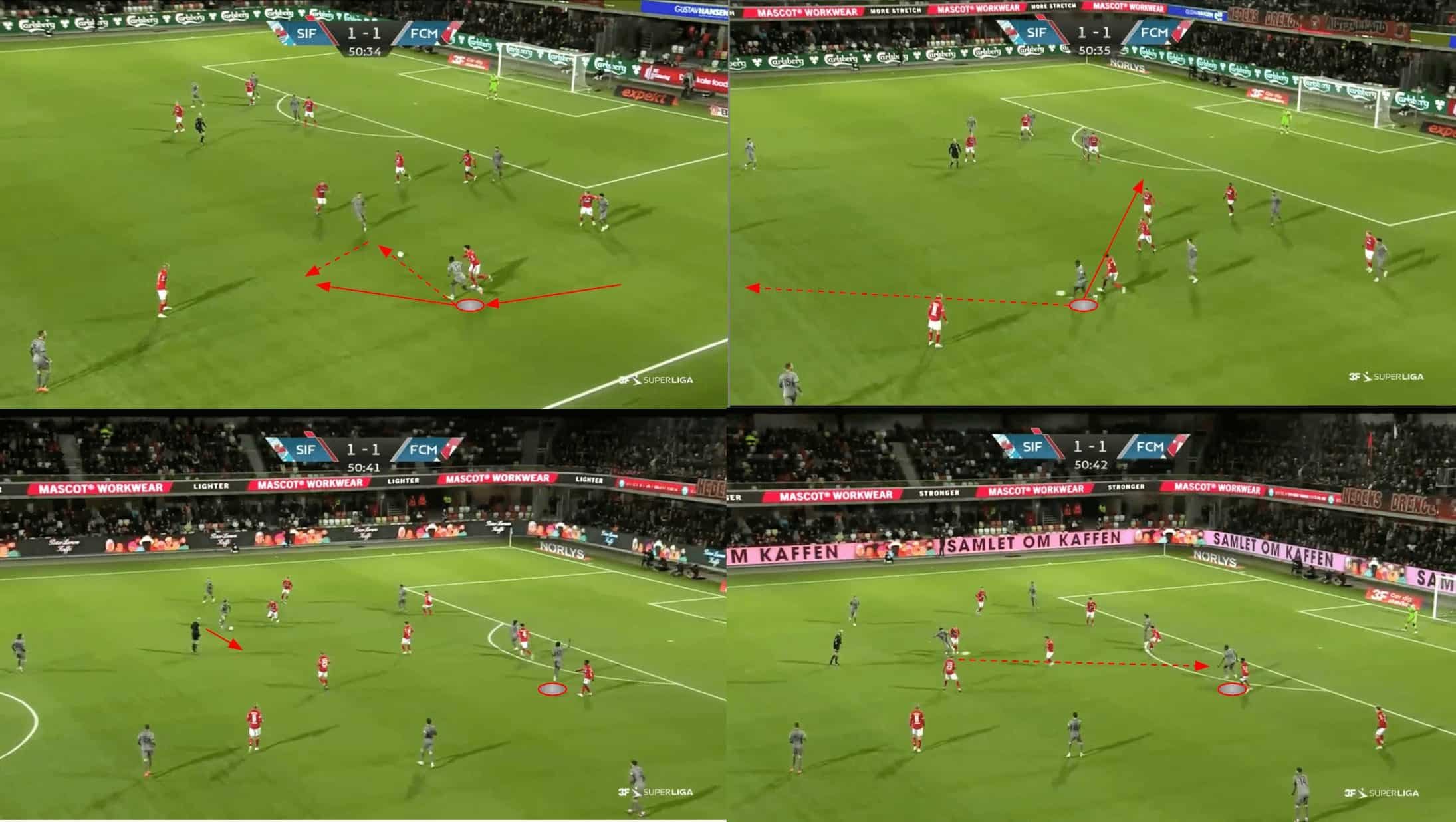 The Midtjylland man is also great at pulling away from the backline and receiving in space, offering himself as a link-up man with his back to goal who can help his team progress into the final third. In this example, he facilitated the team’s final third entry, playing a vital role in linking the midfield to the attack.