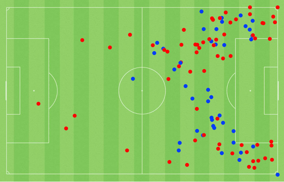 A standout attribute of Soñora is his constant movement to become a passing option, leaving him extremely tough to mark for the opposition. This can be especially influential in the final third to penetrate defensive lines. Alan tends to use these movements to penetrate more than his 1.84 dribbles per 90, despite having a good dribble success rate of 62.69%.