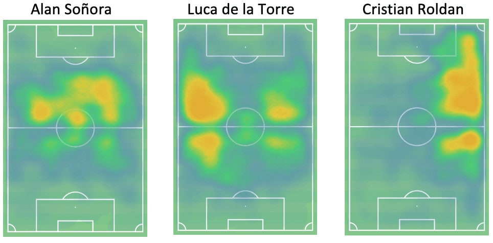 Luca de la Torre, of recently relegated Dutch side Heracles Almelo, and Seattle Sounders’ Cristian Roldan were both midfield call-ups for the USMNT’s June fixtures. These players are not directly comparable, but they would essentially be competing for a place in the midfield unit at the World Cup if Berhalter was to consider Soñora. Looking at the heat maps below we can start to see the role that the three players have at club level and their potential role with the USMNT.