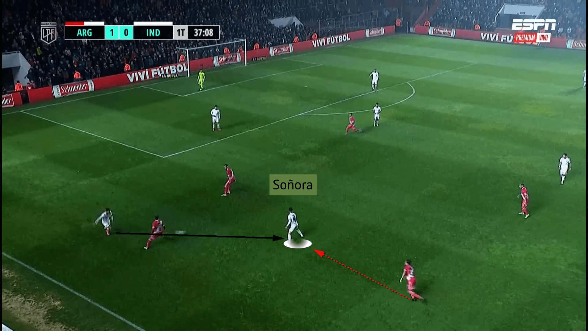 This is an example of Soñora displaying all of his best abilities and habits against Club Atlético Talleres. Soñora vacates the typical attacking midfield space to drop and become a passing option, attracting the attention of two Talleres midfielders. The American uses his aforementioned technical abilities to draw in the two midfielders to decongest the final third and create space in zone 14 and thread a pass into an attacker. Despite options wide and centrally, the attacker returns the pass to Soñora, who has moved to become a passing option and find the right width-holder.