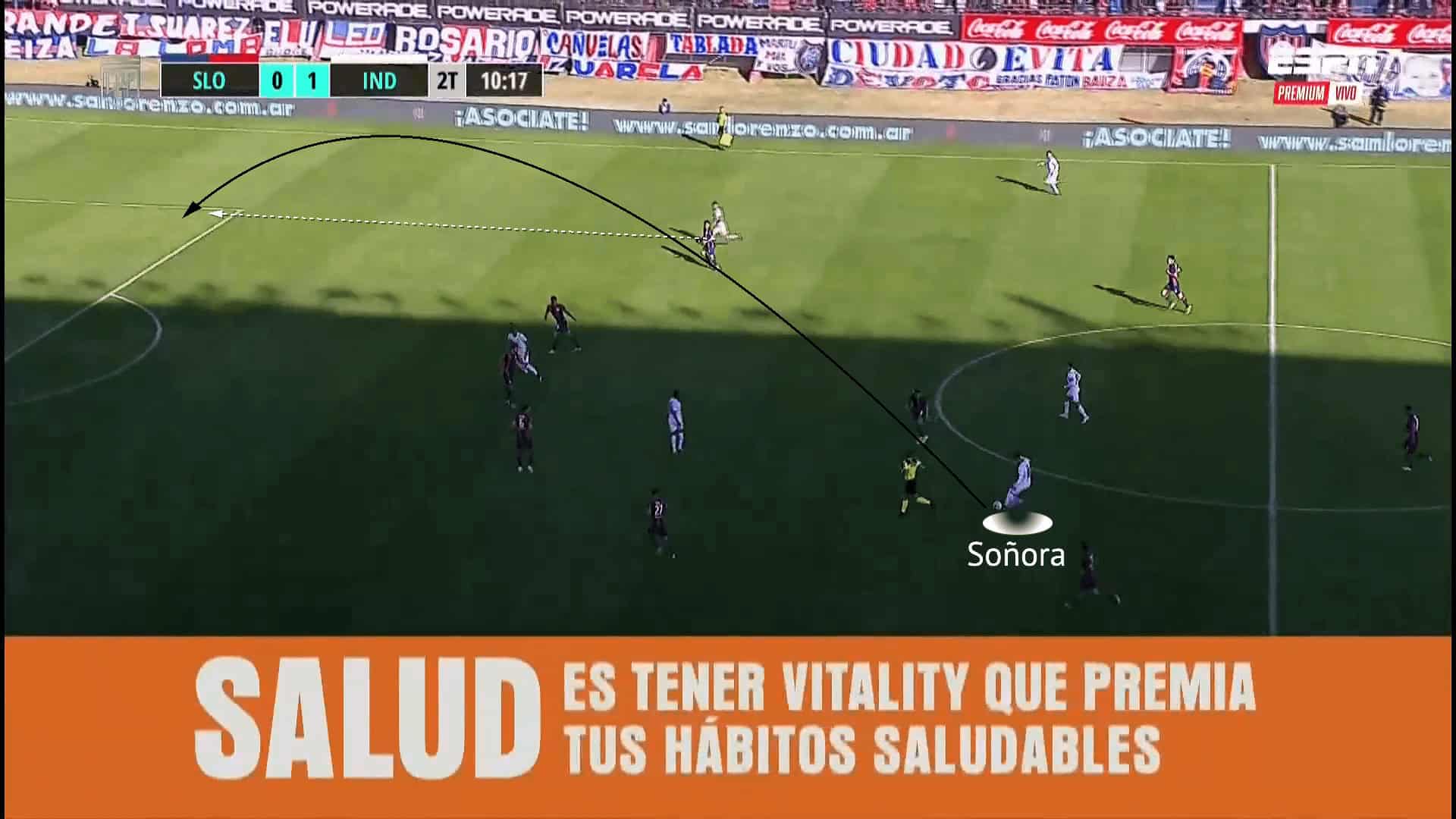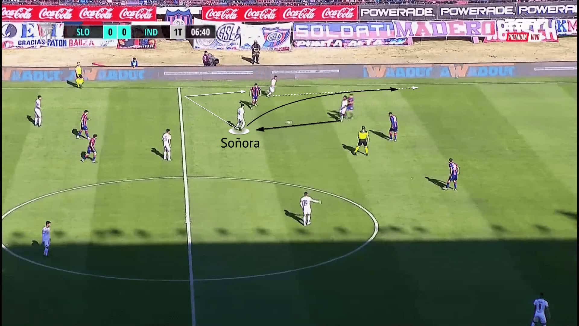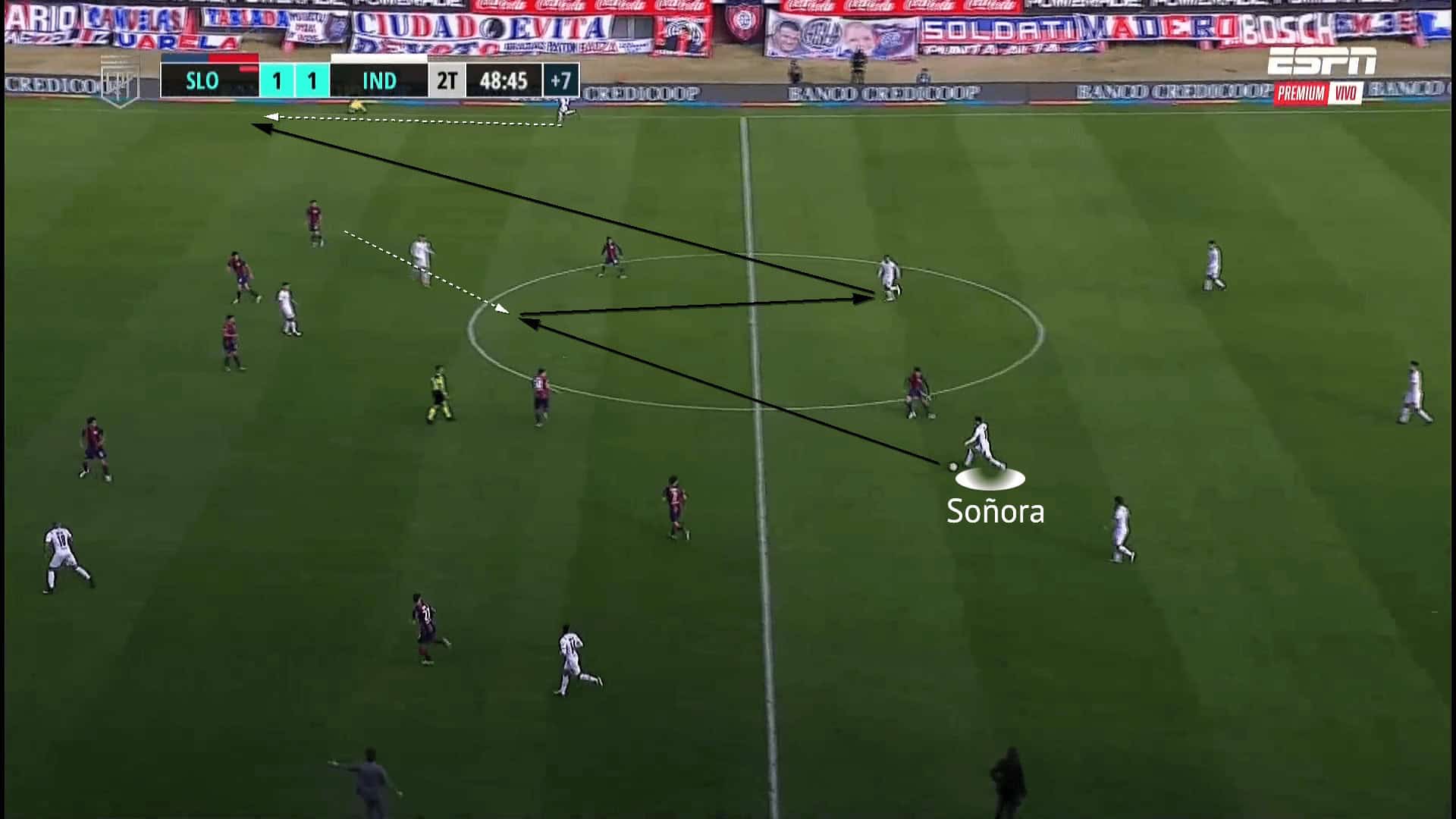 Another strength of Soñora’s game is his ability to draw out opponents and use his technical quality to bypass them. Heavily left-footed, opponents can be deceived by Soñora with the assumption that he will be quite one-dimensional with limited angles from such one-footedness. However, as previously mentioned, his ball manipulation in tight spaces and variety of passing techniques means he can evade opposition pressure. Despite his role as an attacking midfielder, Soñora regularly makes moves into deeper areas. This either drags out opponents or gives him space to turn and play forwards, which is when he is most influential.