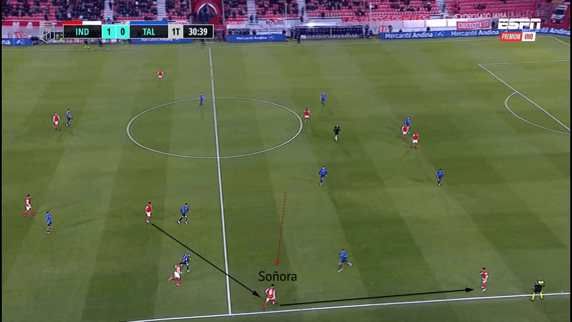 With Independiente also using the wide areas a lot, Soñora is familiar with a side looking to move wide. In the example above, Soñora has received the ball in Independiente’s up-back-through combination and executed a first-time through pass for the left-back to break forwards into the final third. Immediately after playing the pass, the American moved into a position behind the ball as a passing option to retain possession. As the left-back could not successfully penetrate the defence, Soñora received the ball back and recycled the play out towards the other wing.